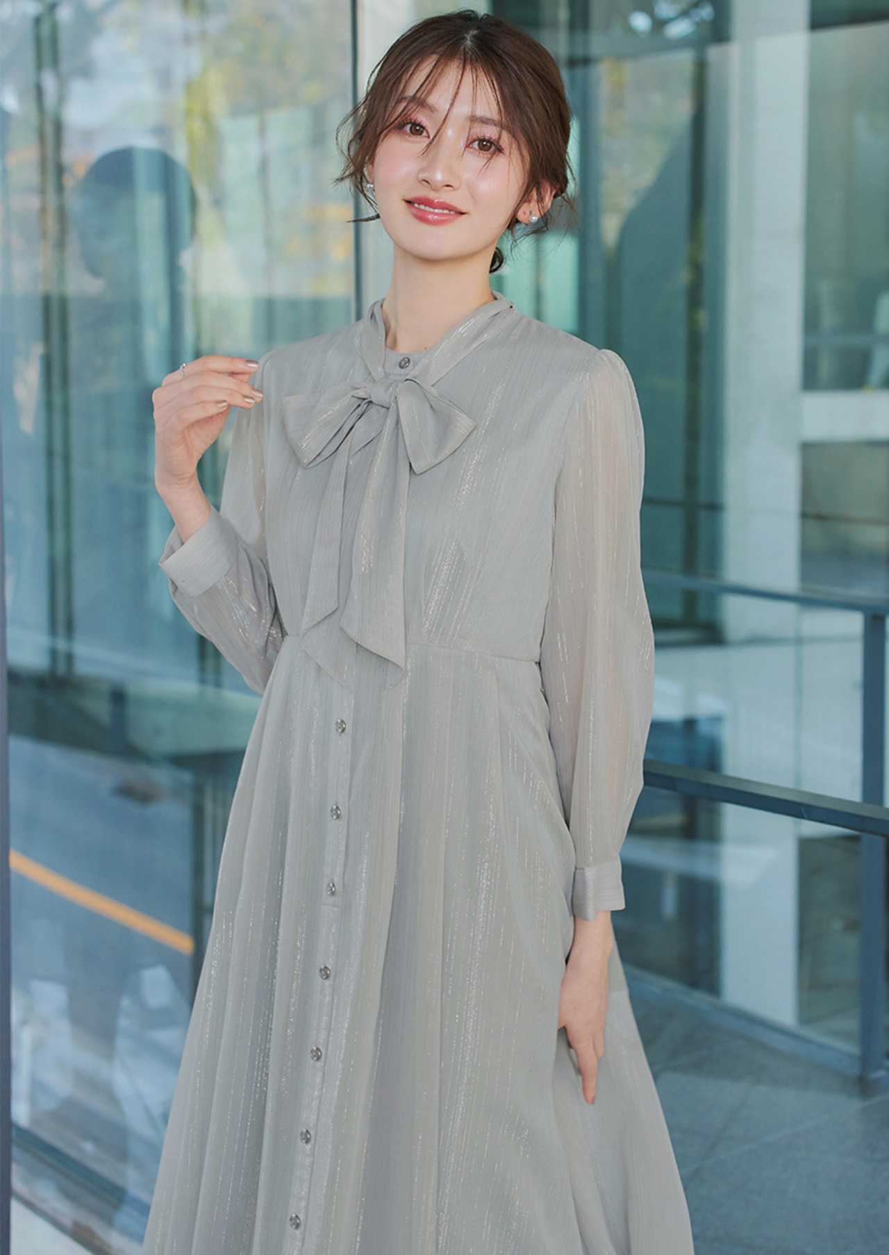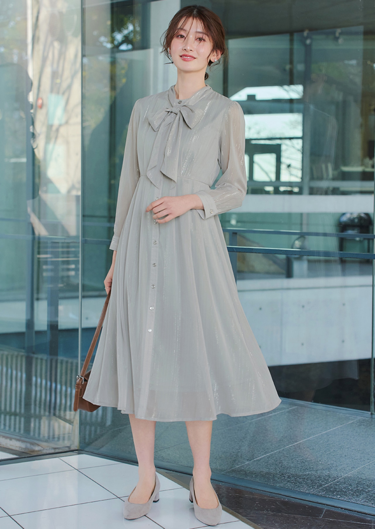 繊細なラメが上品に輝くシアーワンピース。リボンタイで華やかさをプラスし、大人のエレガントなきれいめスタイルに最適です。