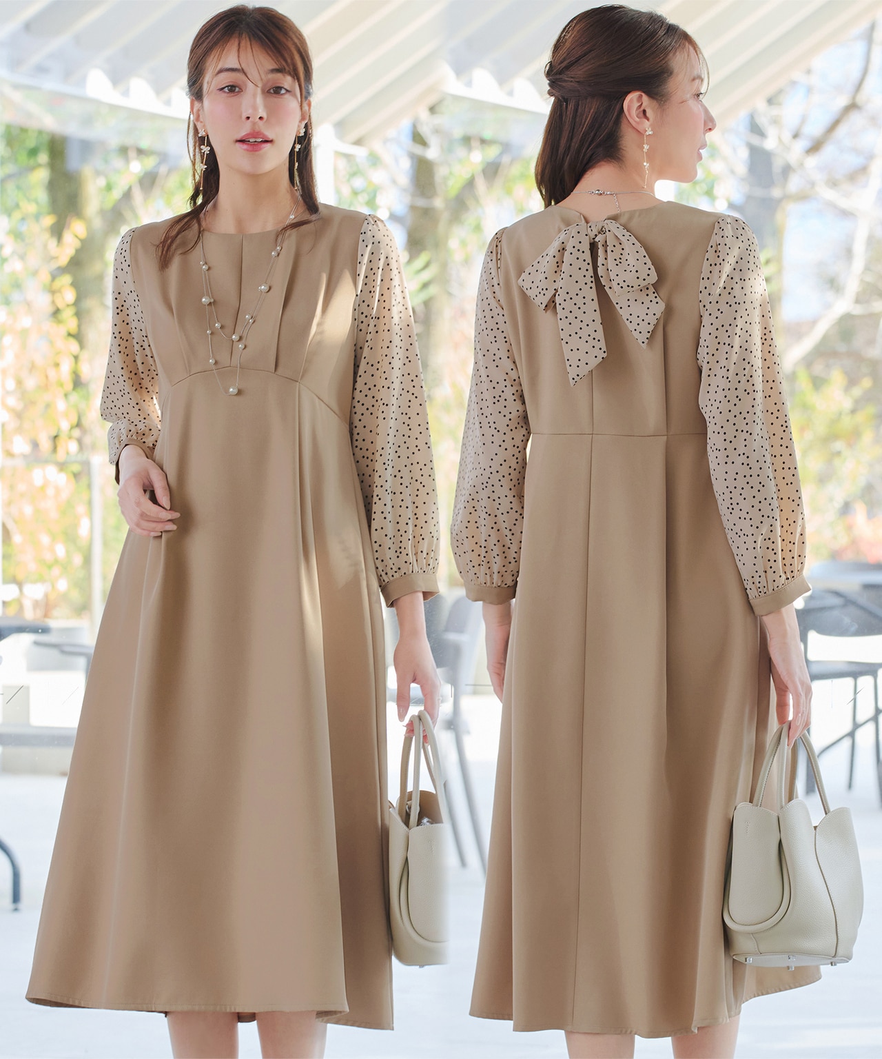 上品なドット柄コンビワンピースが新登場。バックリボンが後ろ姿も大人可愛く、タックで美しいシルエットが叶います。きちんとしたシーンにも可愛くおしゃれに使えるのでおすすめです。