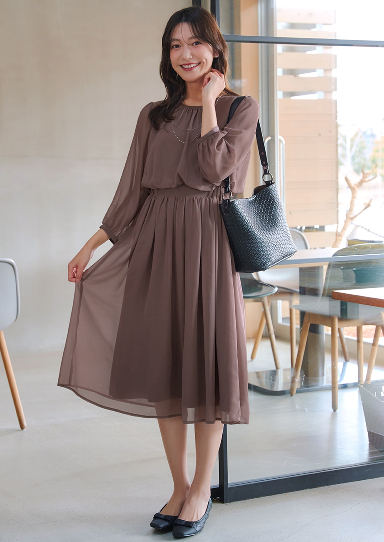 上品なシフォン素材の大人フェミニンワンピース。軽やかな揺れとゴムウエストで快適に、