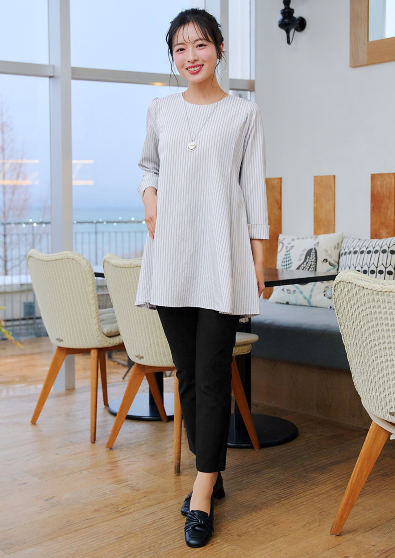 広がるチュニックのシルエットを整えて、