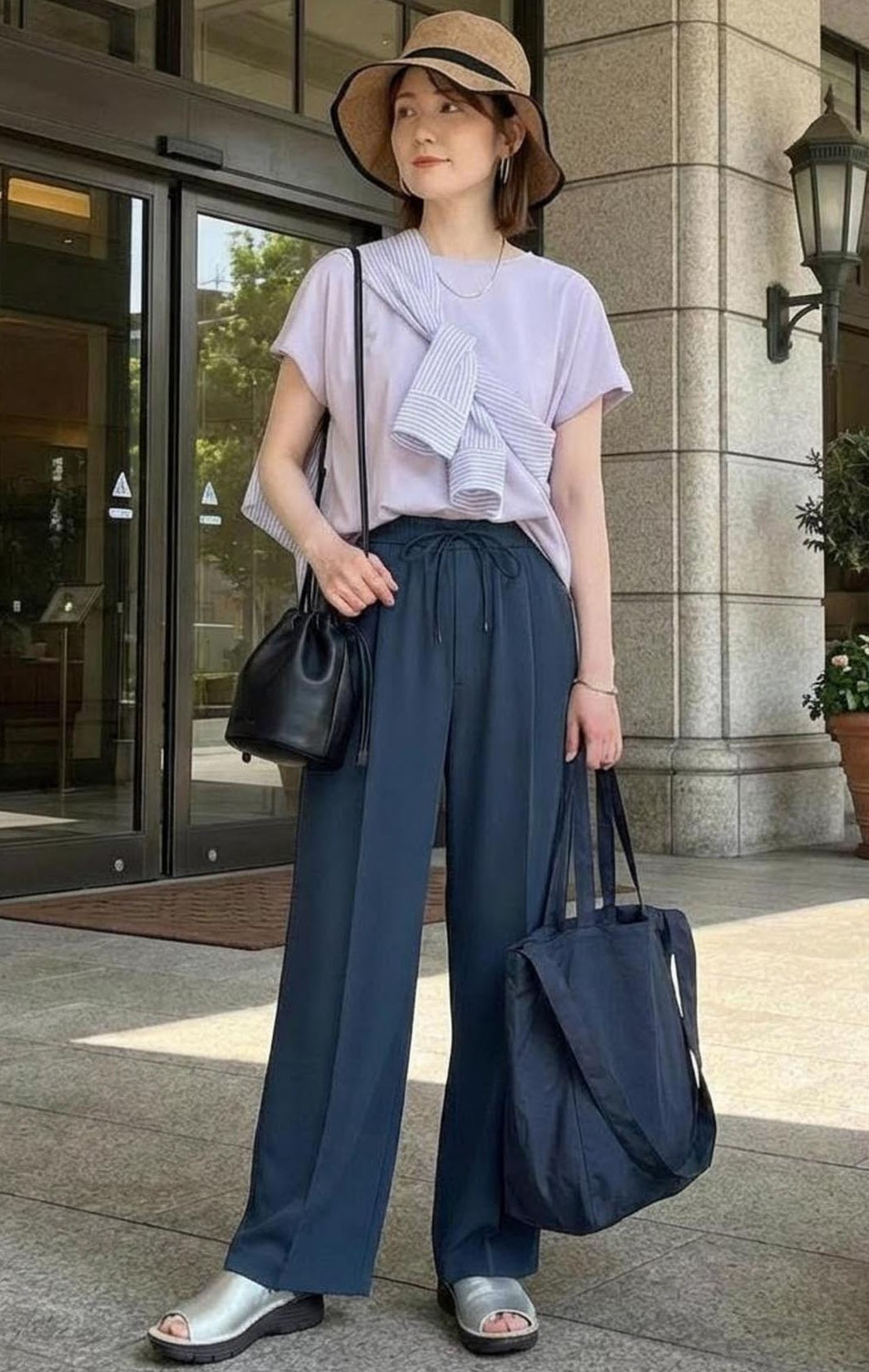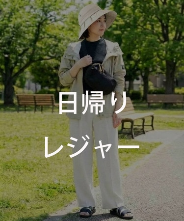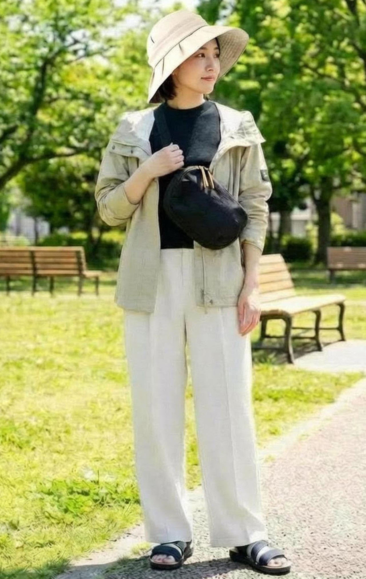 ハットでしっかり日差し対策をしながら顔まわりに柔らかさを出し、コンパクトなボディバッグで動きやすさと必要最低限の収納を確保、サンダルで抜け感と快適さをプラス。
