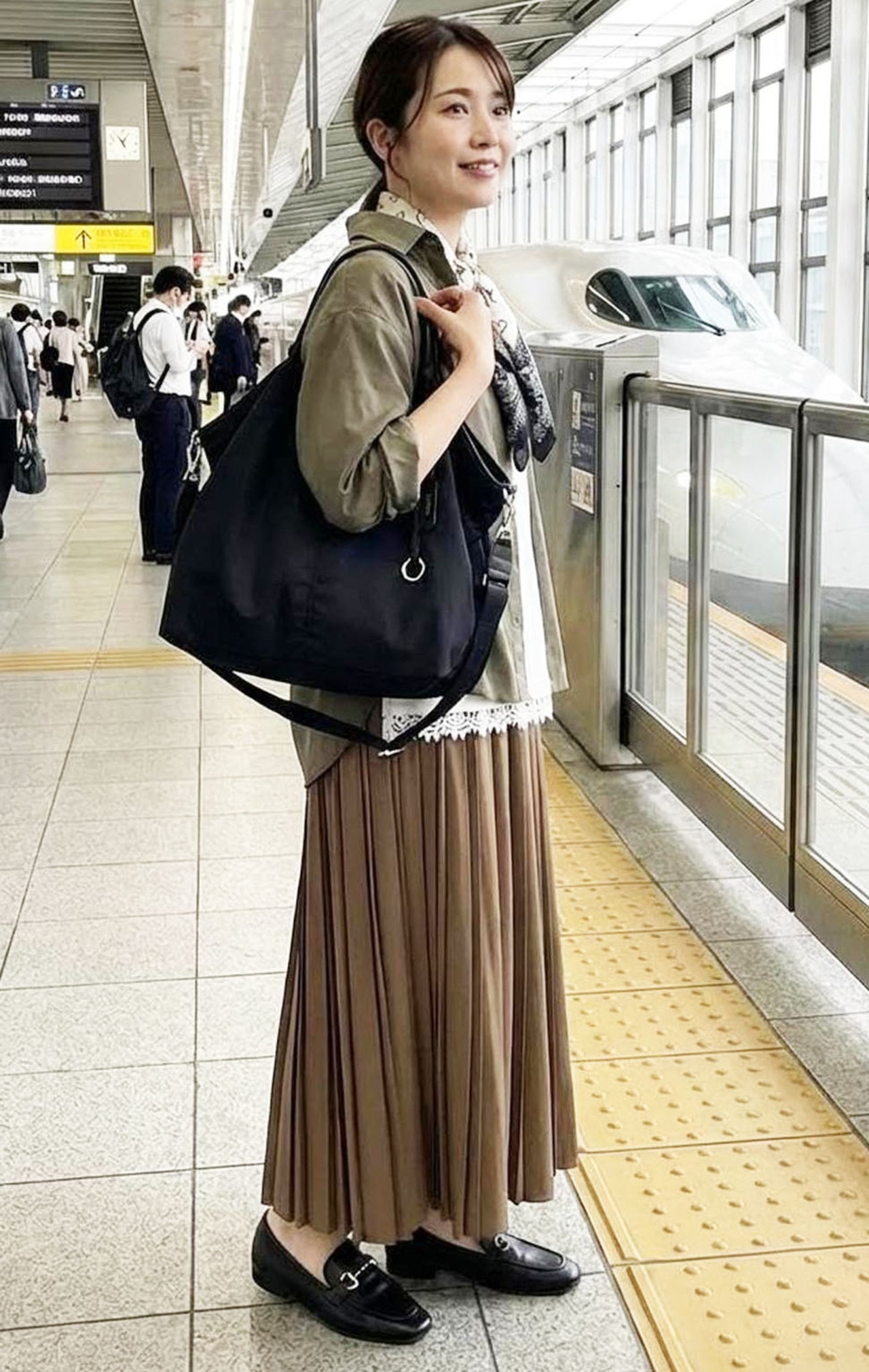 スカーフで顔まわりに軽やかな華やぎを足しつつ、バッグは大きめで実用性をしっかりキープ。