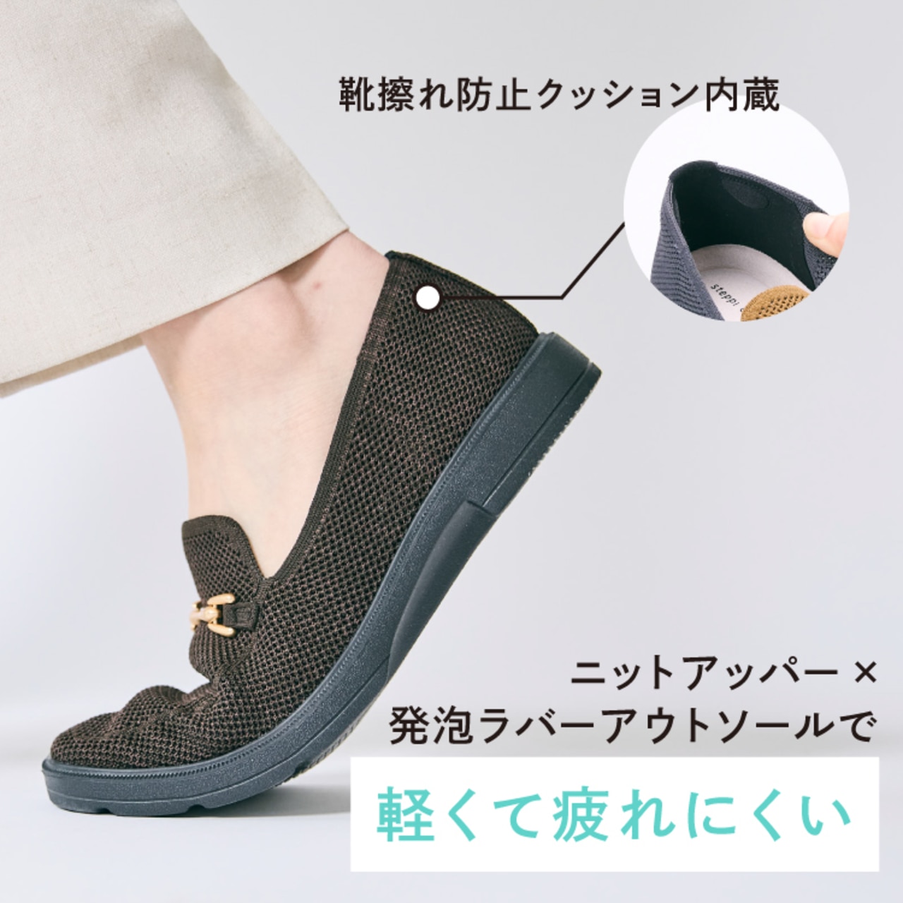 さらに、かかと部分には靴擦れを防ぐクッションを備え、細部まで快適さにこだわりました。 -