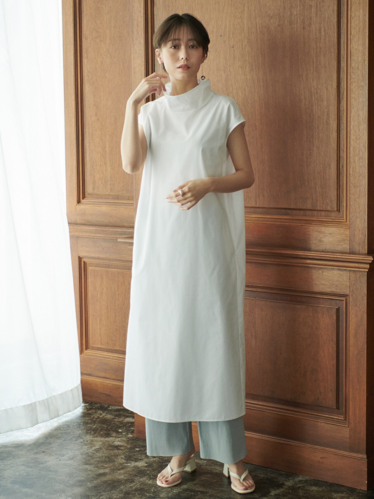 ハイネック+フレンチスリーブで上品な印象のワンピースです。付属のリボンでウエストマークしてもエレガントに決まります。