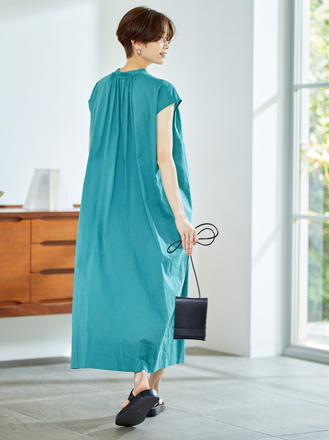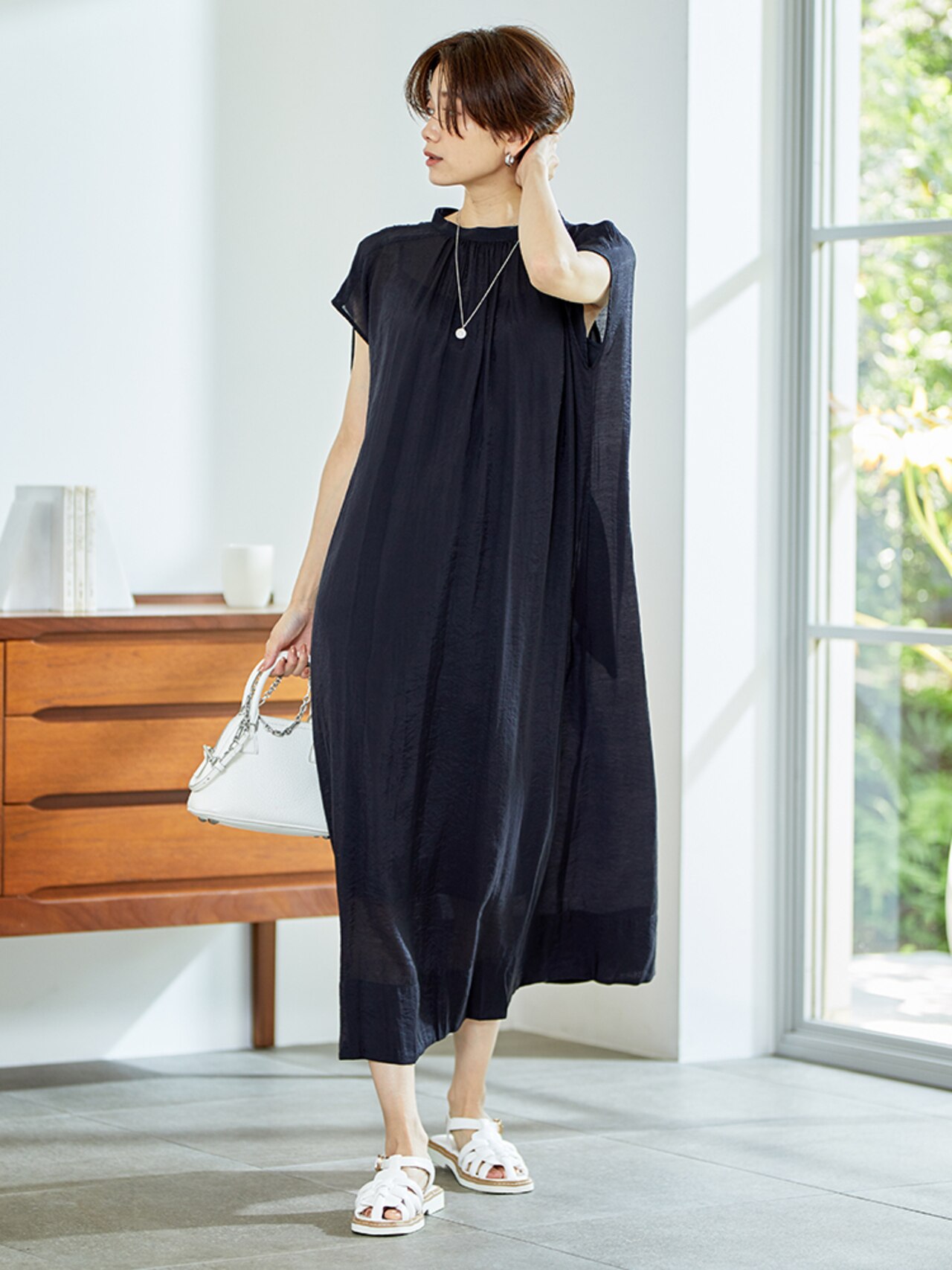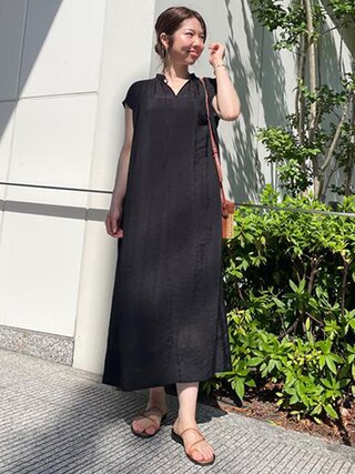 重たく見えがちの黒ワンピもキーネックですっきりしたニュアンスのあるデコルテラインに仕上がります。