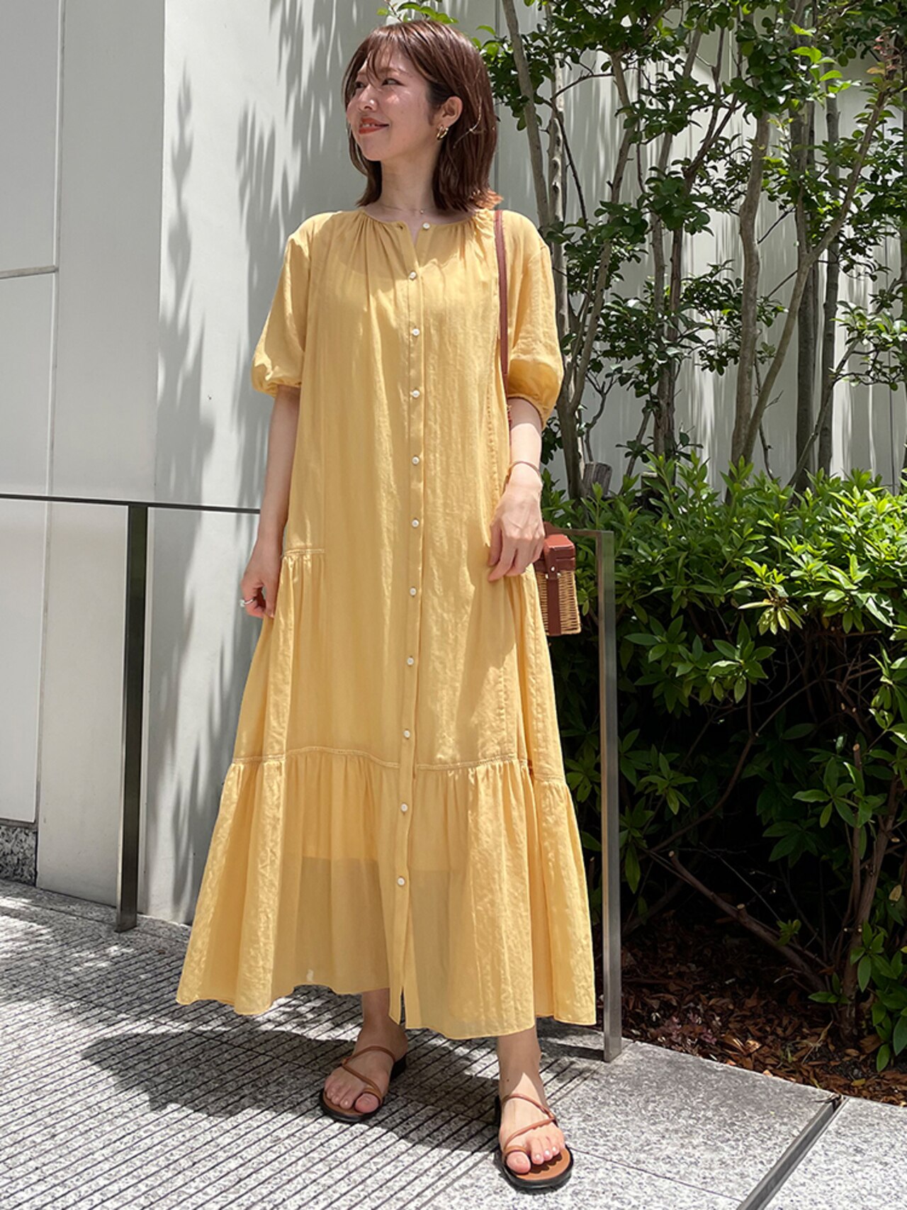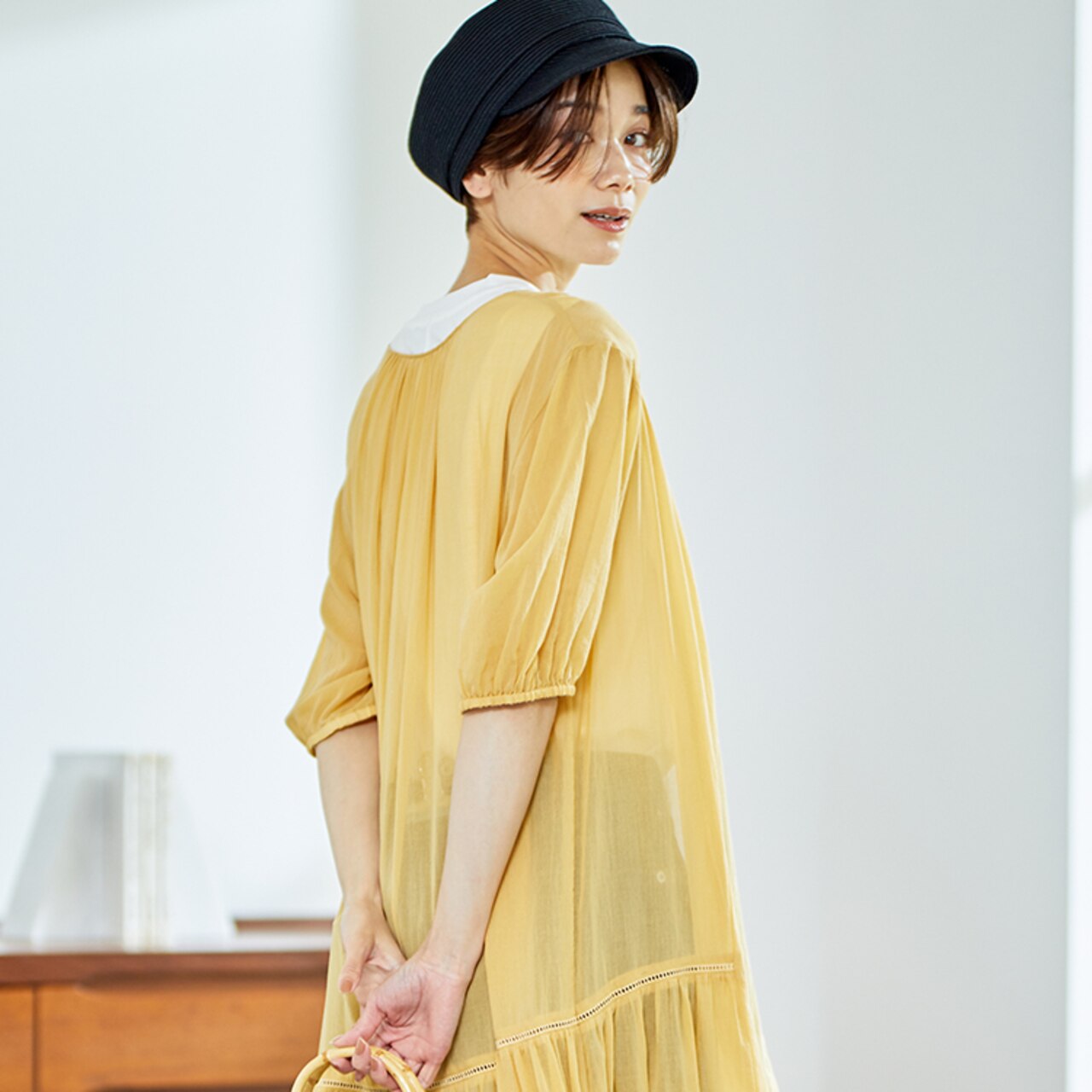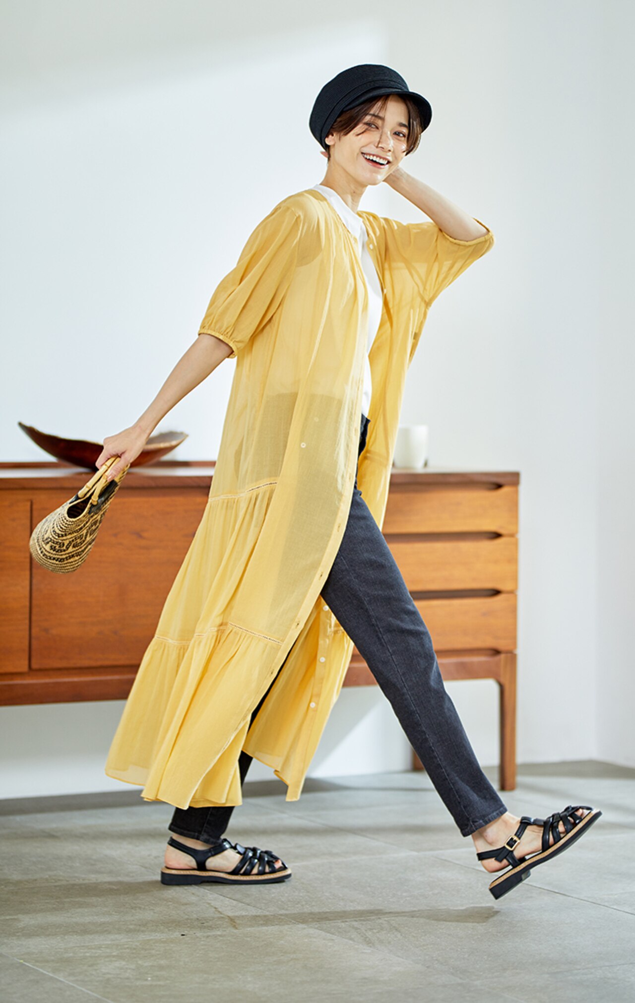 透け感のあるふんわり軽やかなイエローは1枚で着ても品よくヘルシーにまとまります。夏らしいバッグや抜け感のあるサンダルで旬顔コーデにアップデート◎