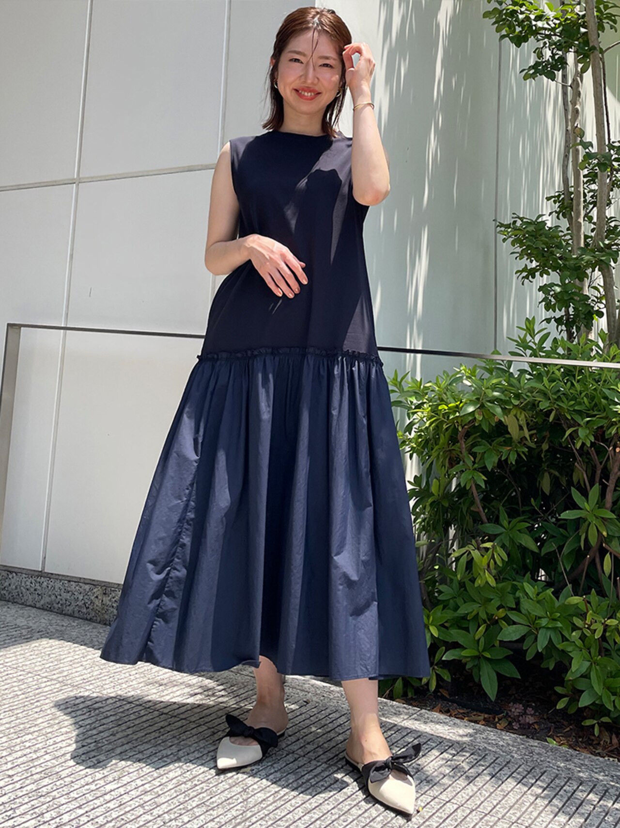 裾の切り替えでふんわり広がるロング丈スカートが大人フェミニンな雰囲気を演出。大きめリボンも足元なら甘すぎず、きちんと感と可愛さをバランスよくまとめます◎