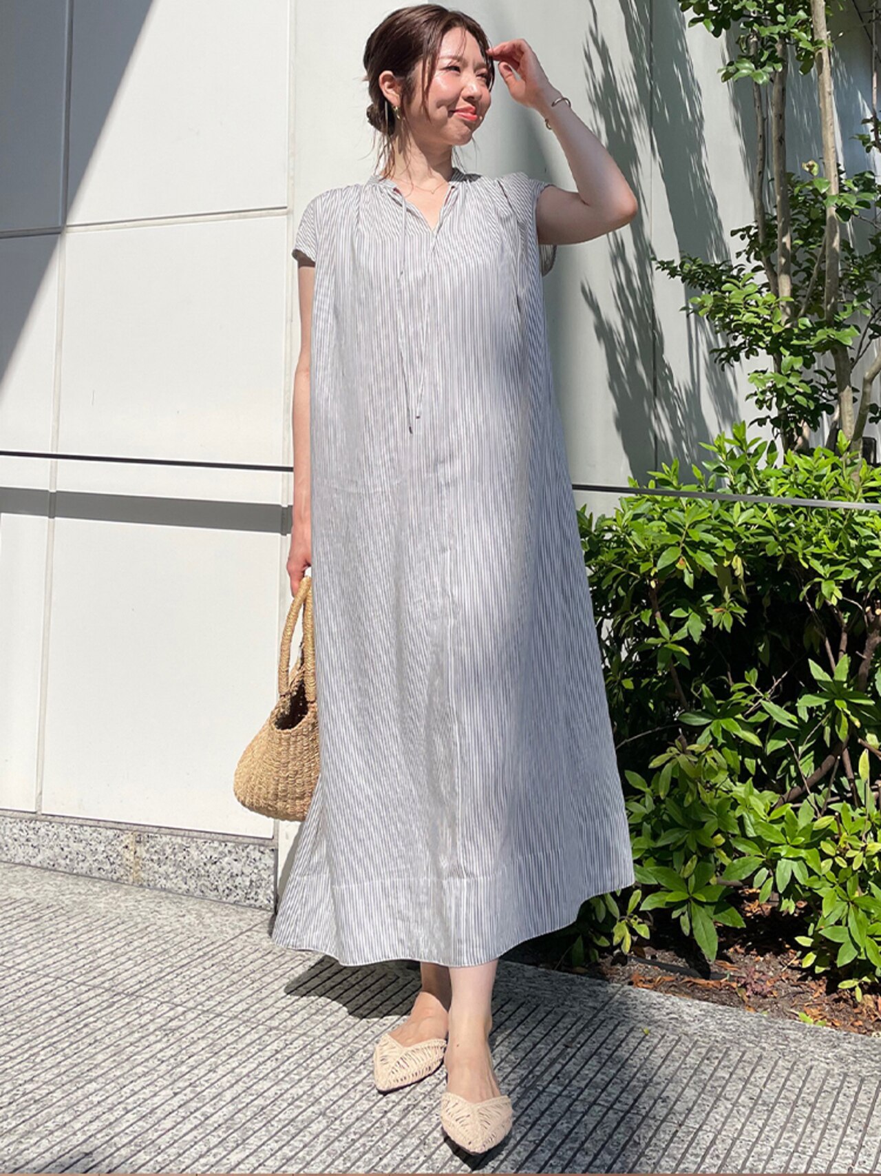 グレー×白の落ち着いた印象のストライプにはバッグと靴にナチュラル素材を。小物選びで何気ない抜け感を見せて一気に軽やかな夏の風を感じて♪