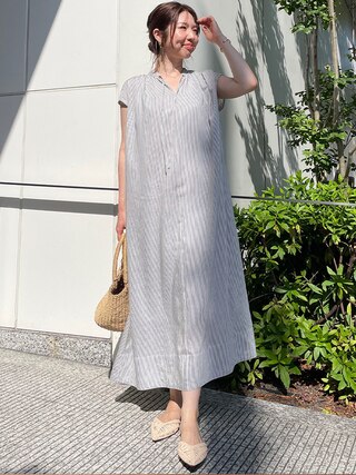 縦長効果でスッキリ見せてくれるストライプは1枚で涼しげで上品な雰囲気に。シンプルコーデに麦わら帽子をかぶって夏コーデを引き立てて。