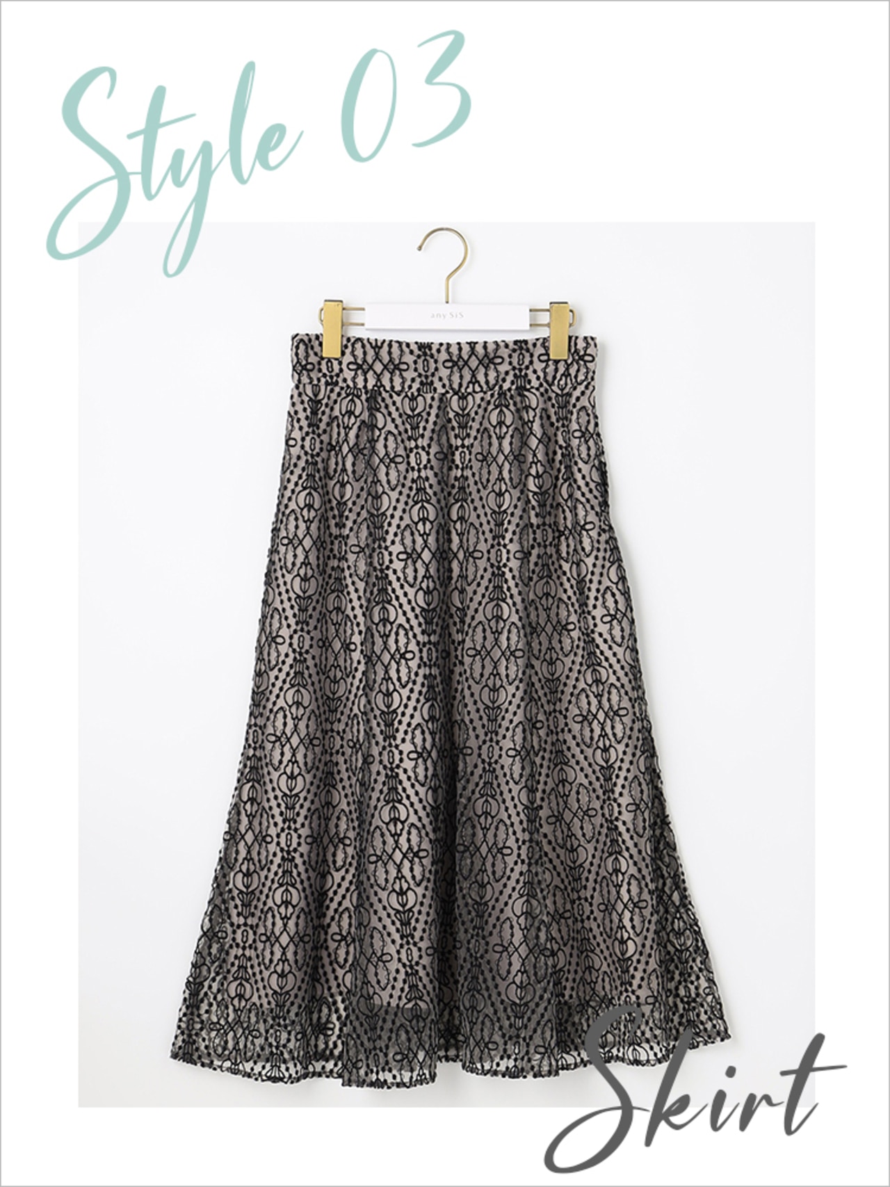 繊細なアラベスク刺繍が可憐な印象のフレアスカート。シンプルなアイテムにも着映えする、主役級アイテムです。