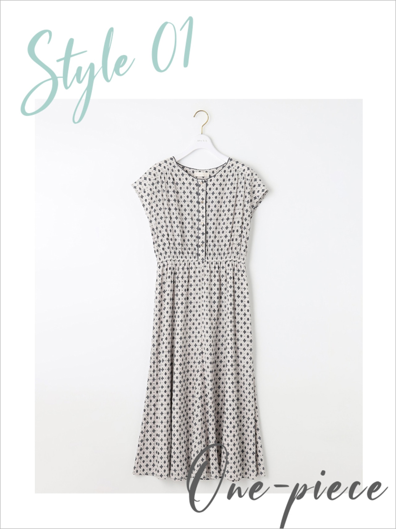 一枚でラクチンなワンピースは夏の強い味方。落ち着いた印象の色柄もので、かつ丈感も長すぎないものをチョイスすればオンオフどちらも着回し可能に♪
