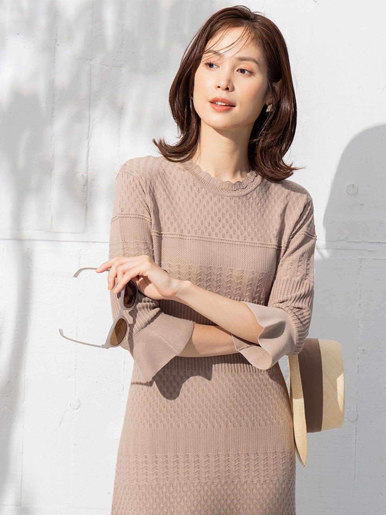 フィット&フレアシルエットのボウタイワンピース。絶妙な丈感で、動くたびに揺れる裾が美しい一枚。上身頃のややゆったりとしたシルエットや、肩が隠れる袖丈のデザインは上半身をすっきり見せてくれます。ウエストはゴム仕様になっているため着心地も抜群です。