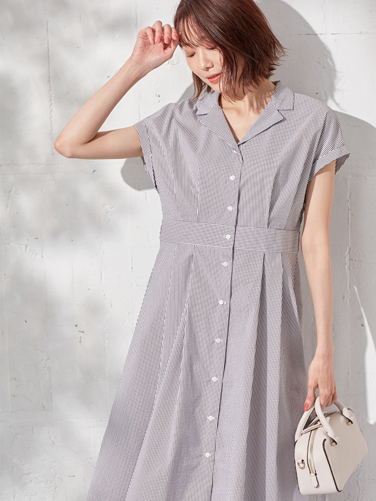 一枚で上品に決まる、夏のおでかけにぴったりなシャツワンピース。凹凸のある表面感が肌離れも良く、さらっとした肌触りが涼しげなサッカー素材を使用しています。バスト下のウエストマークでスタイルアップ見えを図り、開襟シャツ襟で知的な印象もプラスされた一枚です。