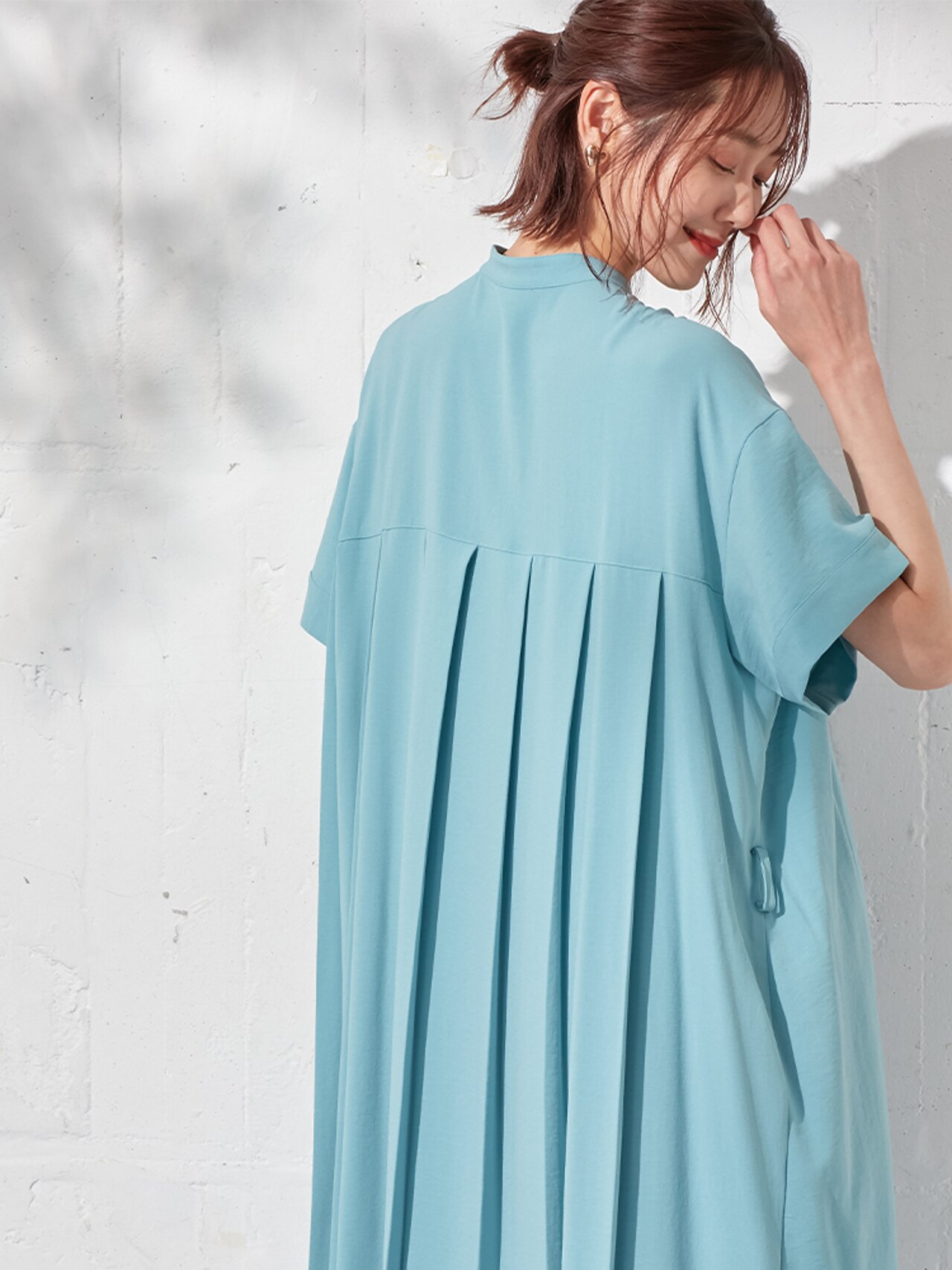 動くたびに揺れるバックプリーツが目を引くワンピース。薄手で軽くストレッチ性のあるジョーゼット素材を使用しております。落ち感とドライ感があり、さらりとした肌触りなので、これからの季節に最適。共布ベルト付きなので、ウエストマークしたきれいめスタイル、ベルトなしのゆったり抜け感スタイルと、その日の気分にあったスタイルで着こなせるのも嬉しいポイントです。