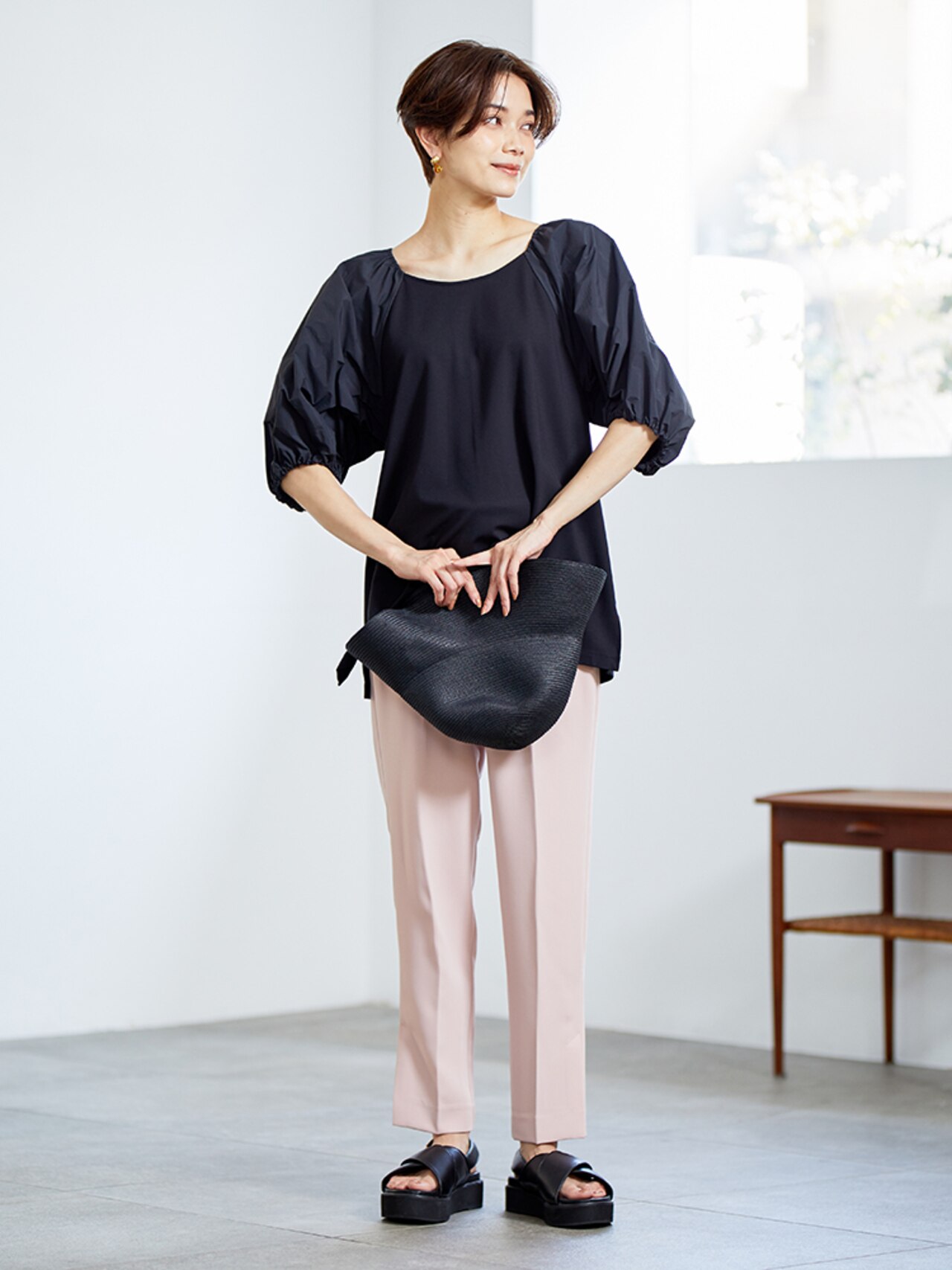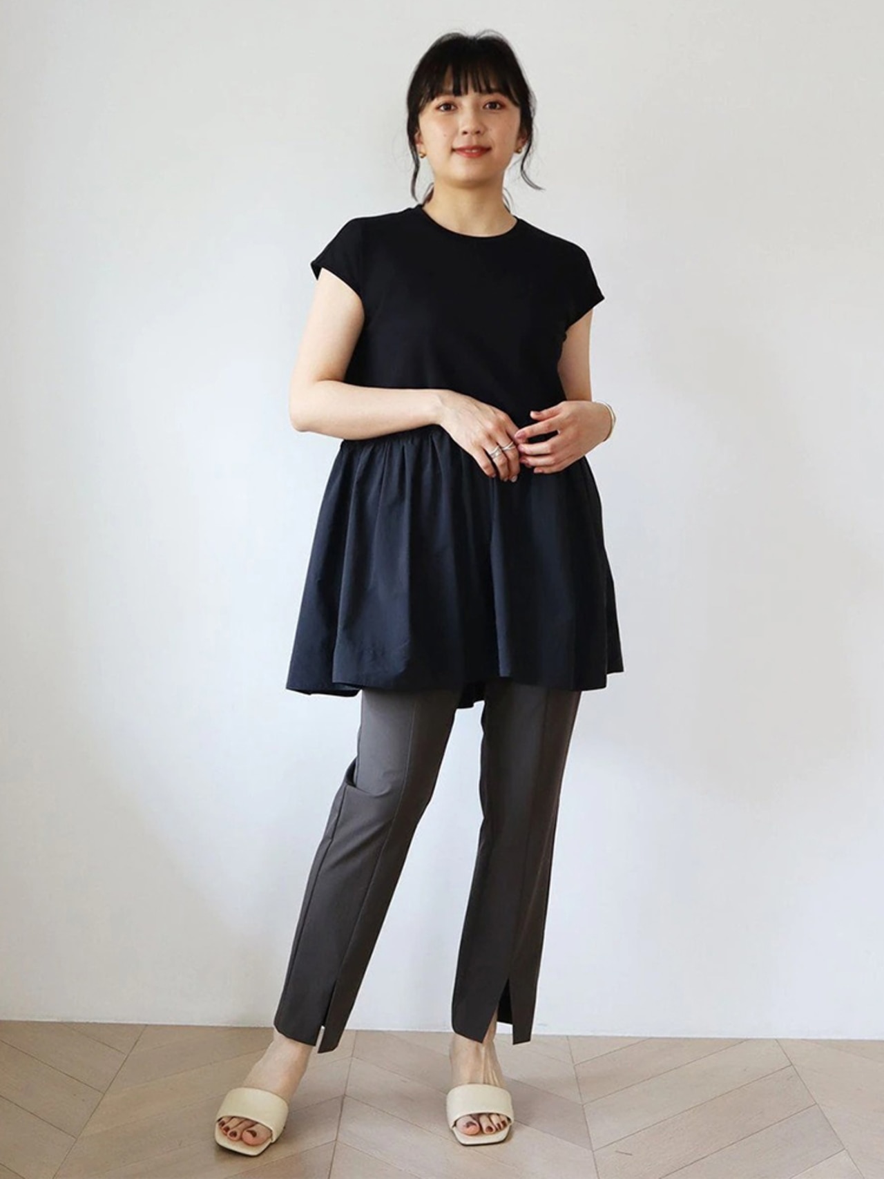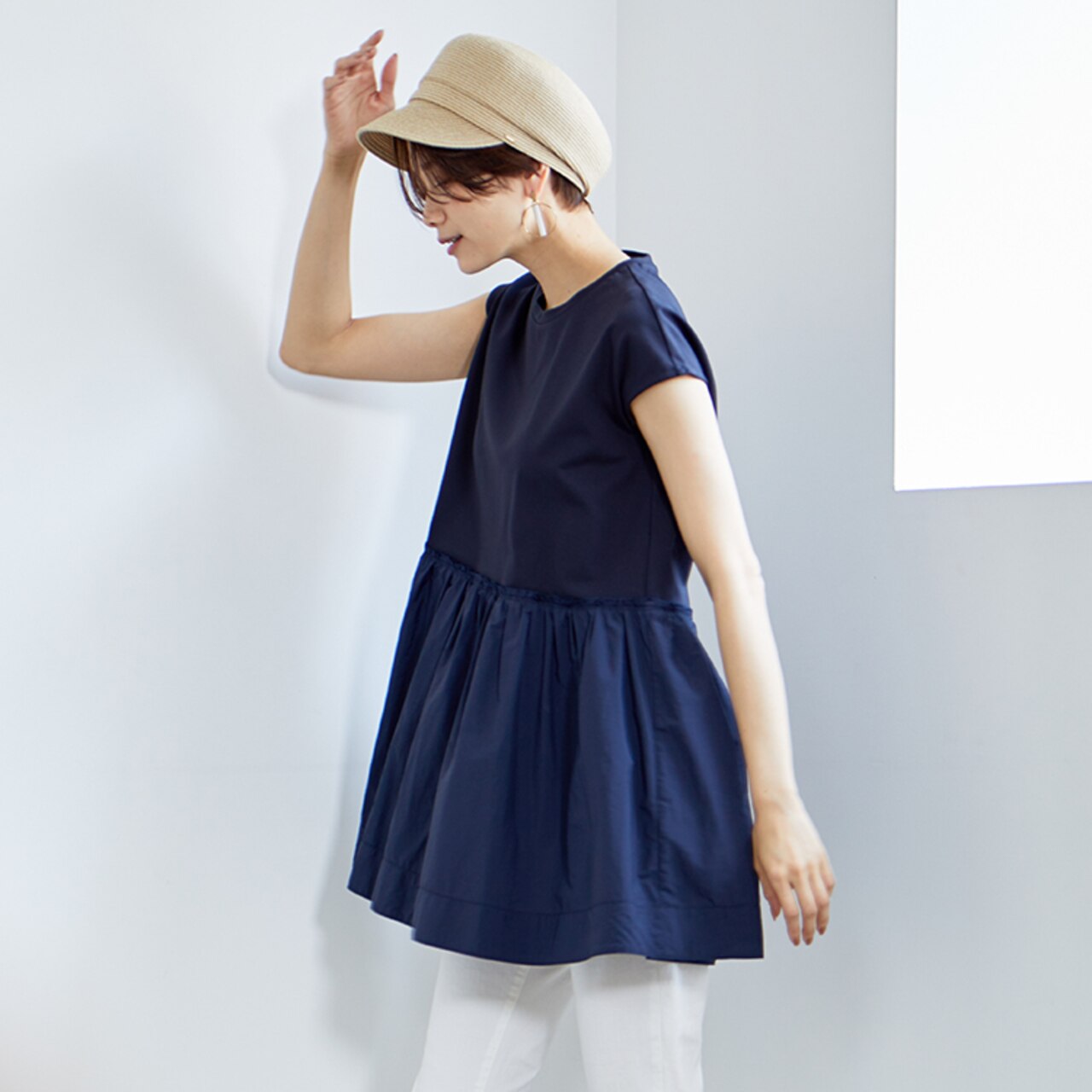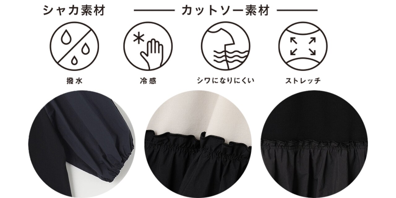 これまでパンツやTシャツが大好評だった「マイビューティ」シリーズから新作登場!高機能で着心地抜群のカットソー素材と控えめなハリツヤが上品なシャカ素材をコンビで使用しています。