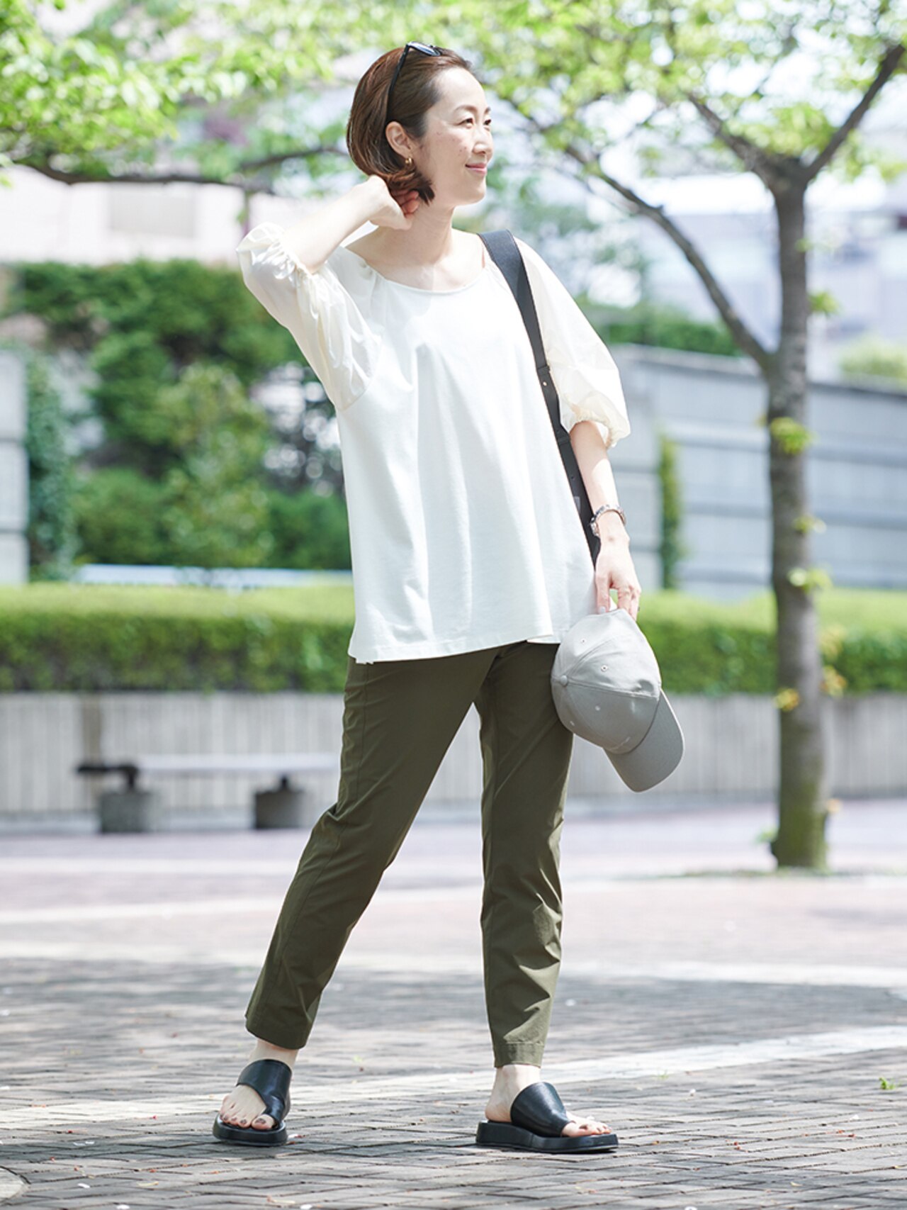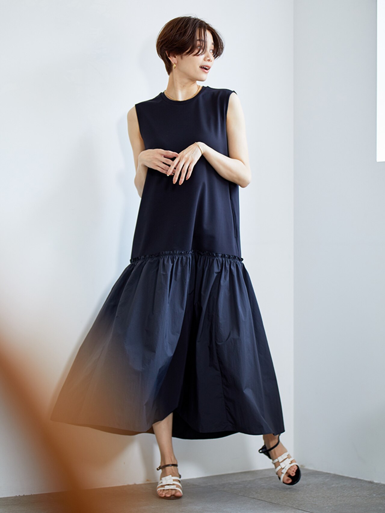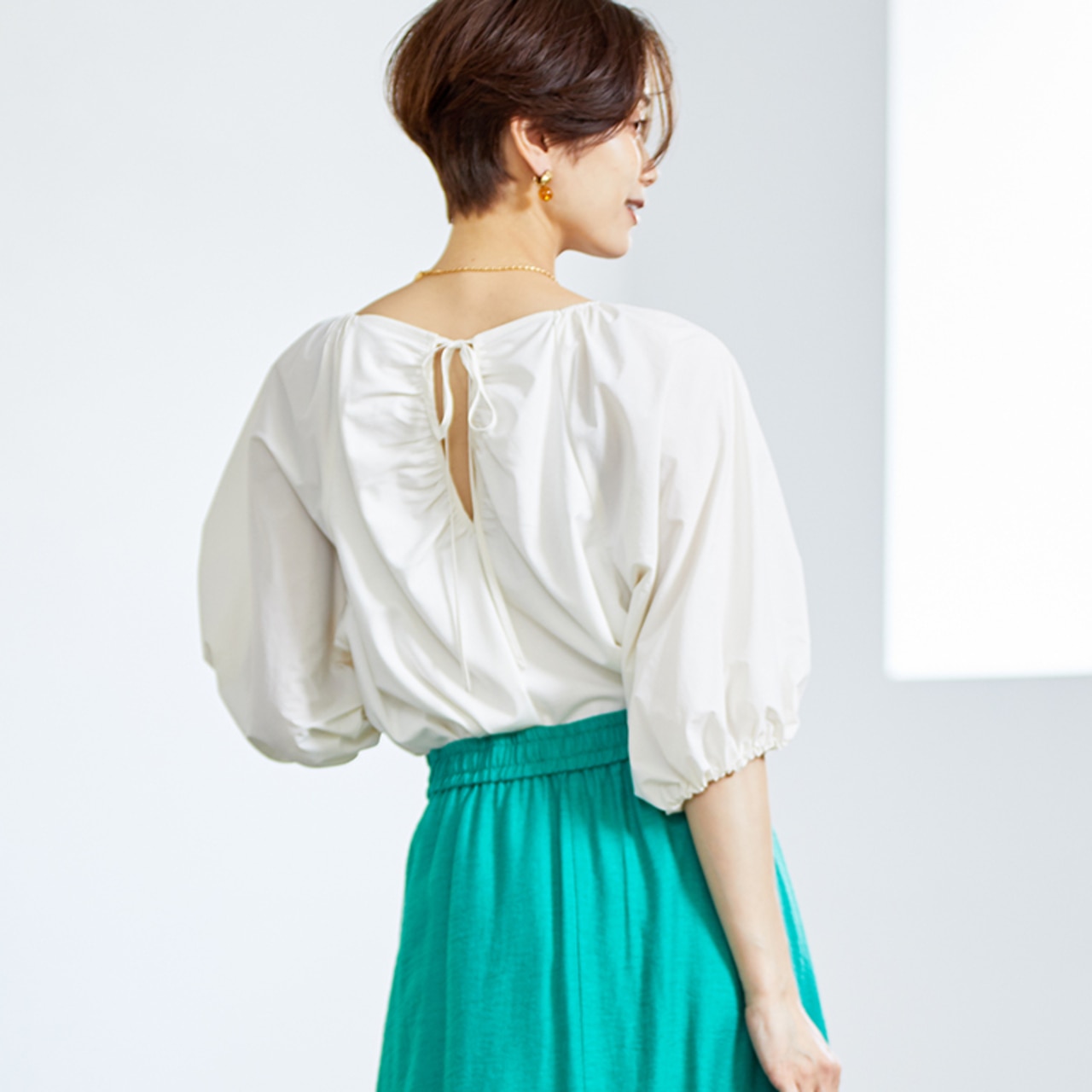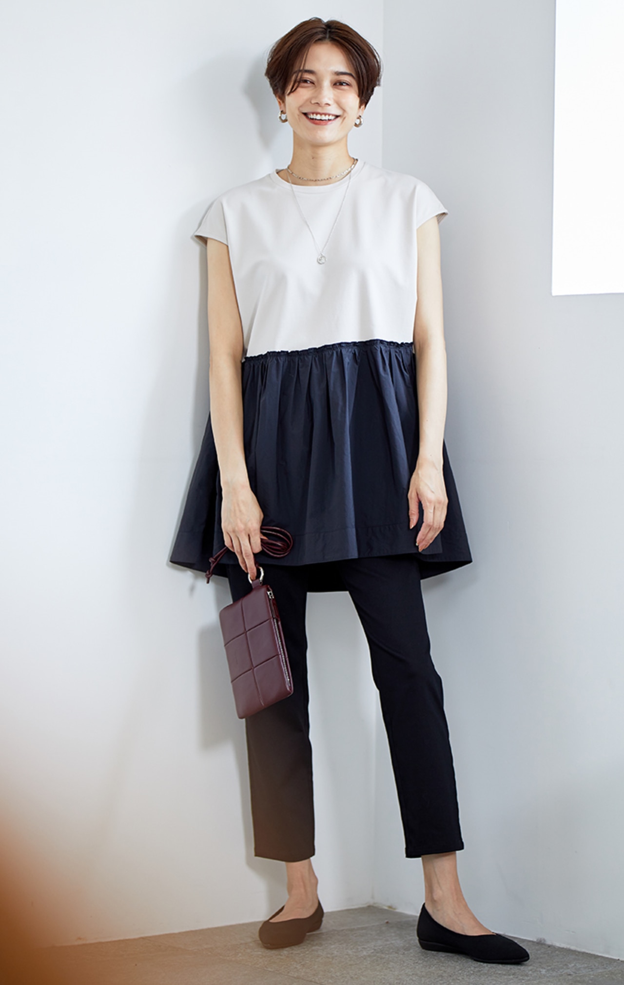 これまでパンツやTシャツが大好評だった「マイビューティ」シリーズから新作登場!高機能で着心地抜群のカットソー素材と控えめなハリツヤが上品なシャカ素材をコンビで使用しています。