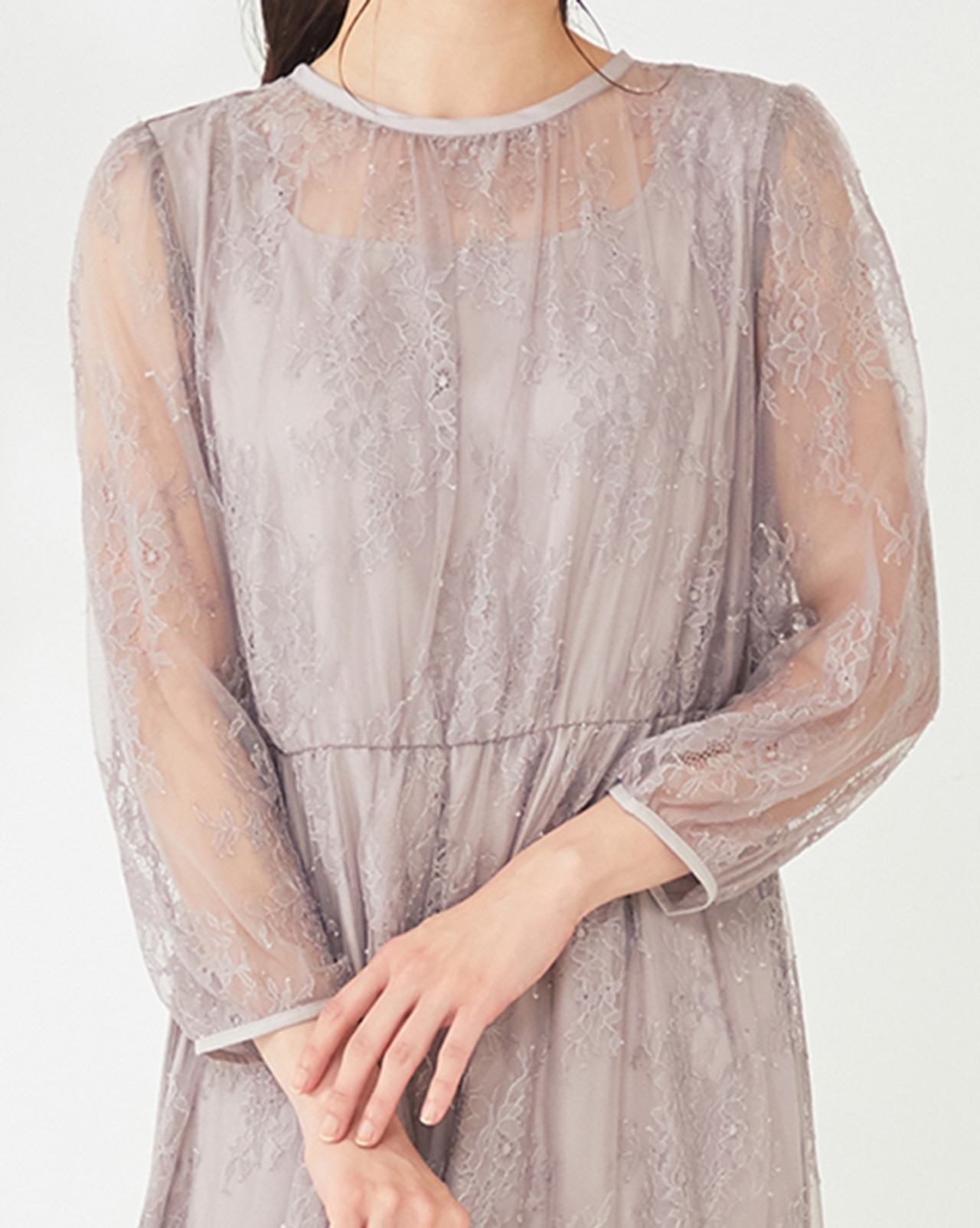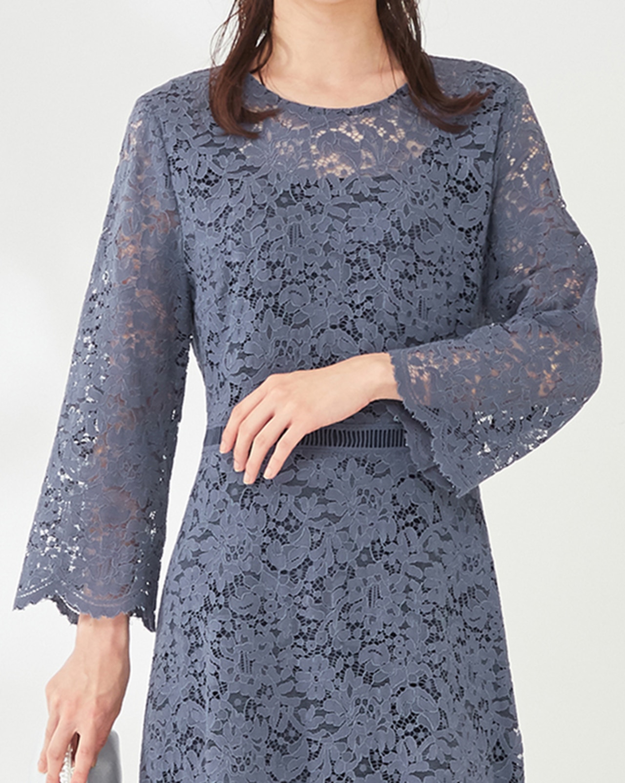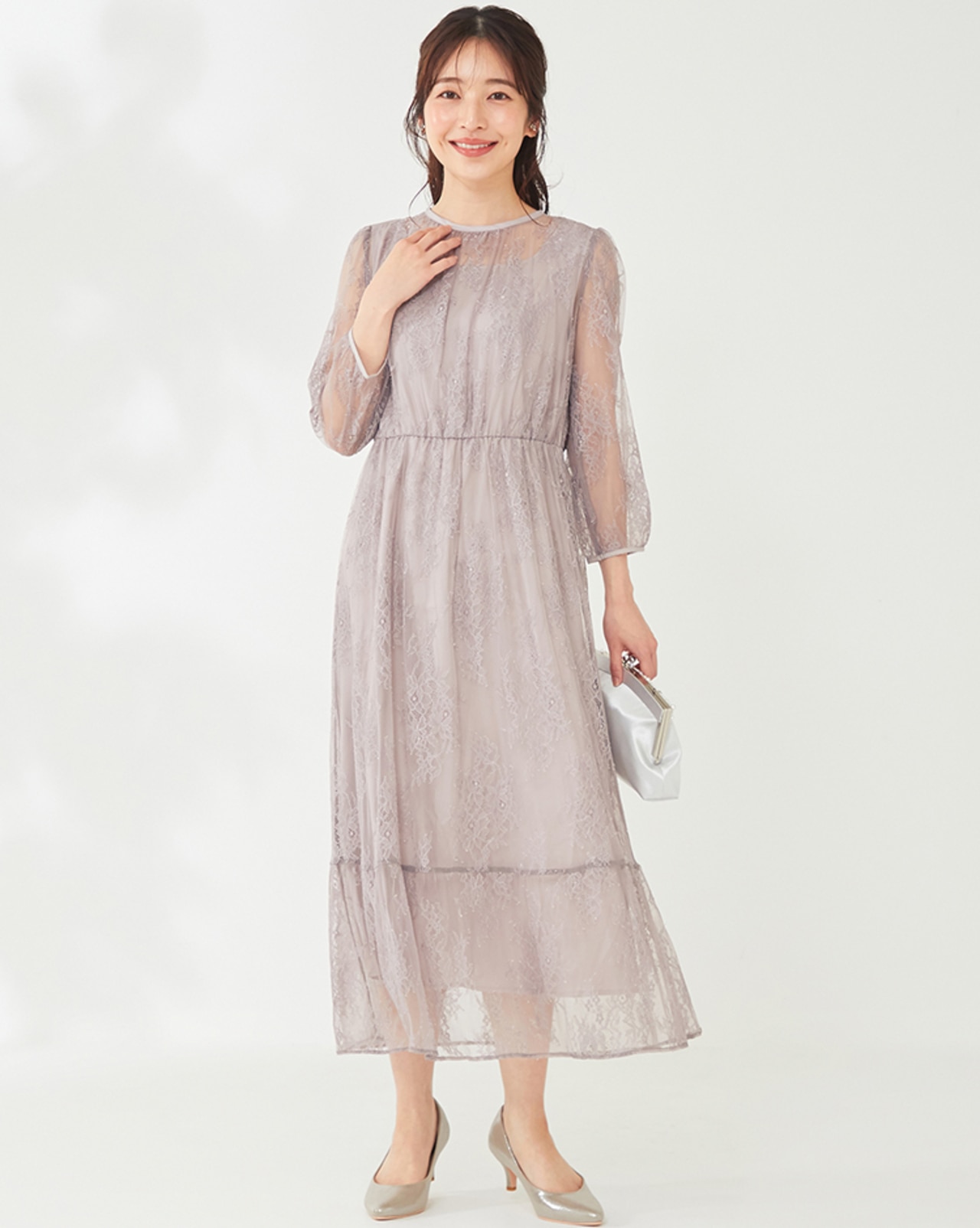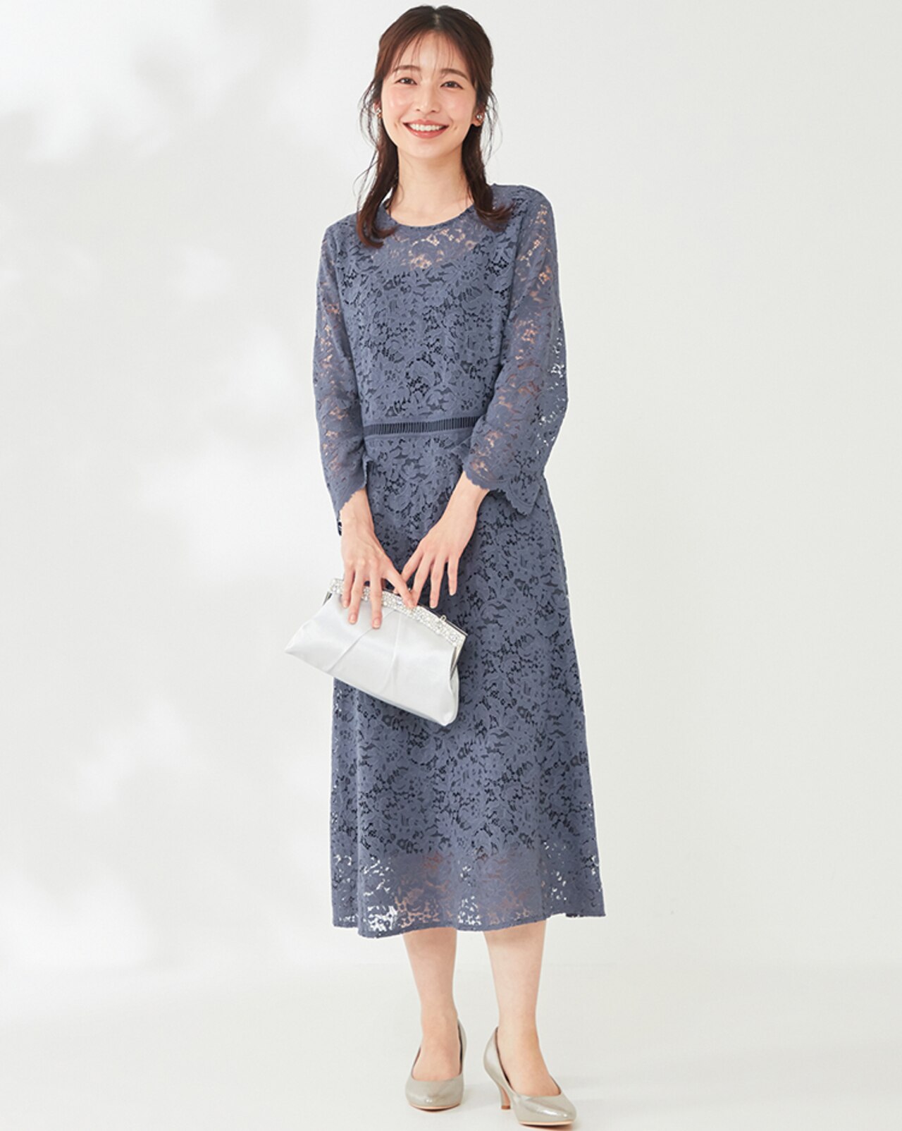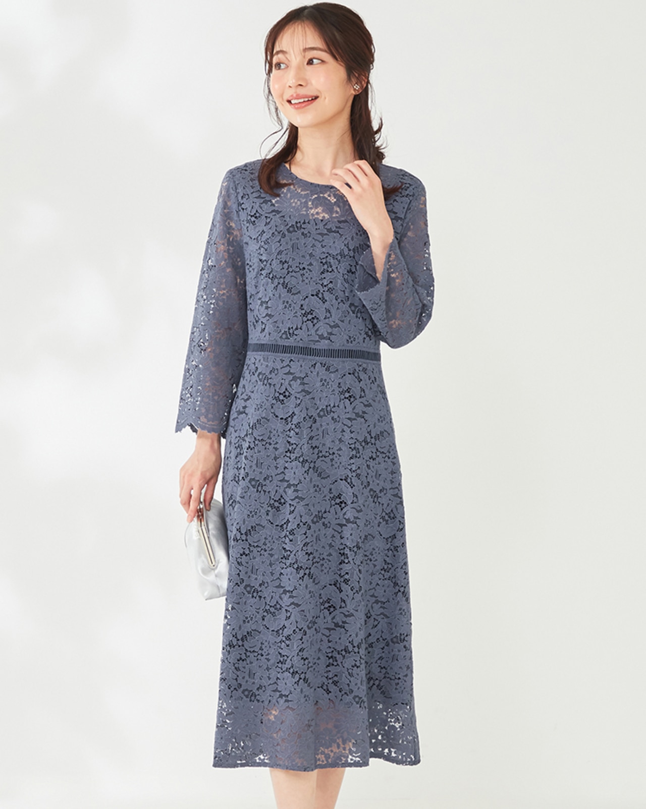 繊細なレースのワンピースは程よい透け感がポイント。品良く肌見せして女性らしさを引き立て好印象に仕上がります。