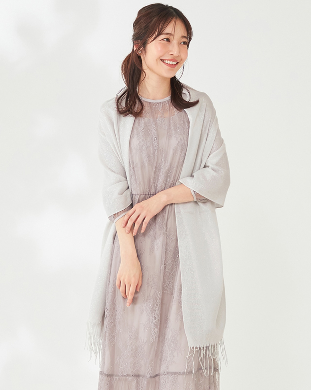 屋外や、夜のパーティシーンでの体温調節にはショールが最適!さり気ないラメ感で華やかさをUPして心置きなく楽しんで。