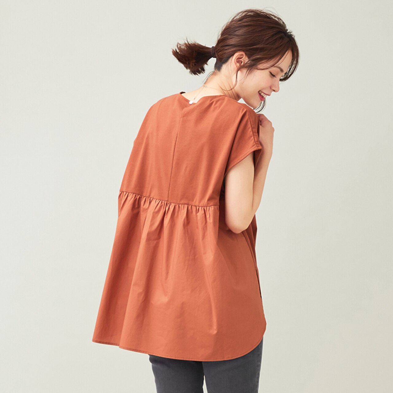 バックフレアデザインがポイントの異素材コンビプルオーバー。さらりとした肌触りに加え、ひんやりと感じる接触冷感機能を備えているので、今の時期から秋まで長く着て頂けます。ポジティブカラーのテラコッタは気分も高まります。