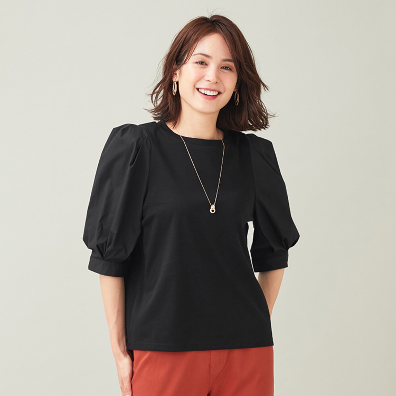 タック袖がポイントの異素材コンビプルオーバー。さらりとした肌触りに加え、ひんやりと感じる接触冷感機能を備えているので、今の時期から秋まで長く着て頂けます。万能なブラックはボトムにカラーを取り入れやすく、デイリーに活躍します。