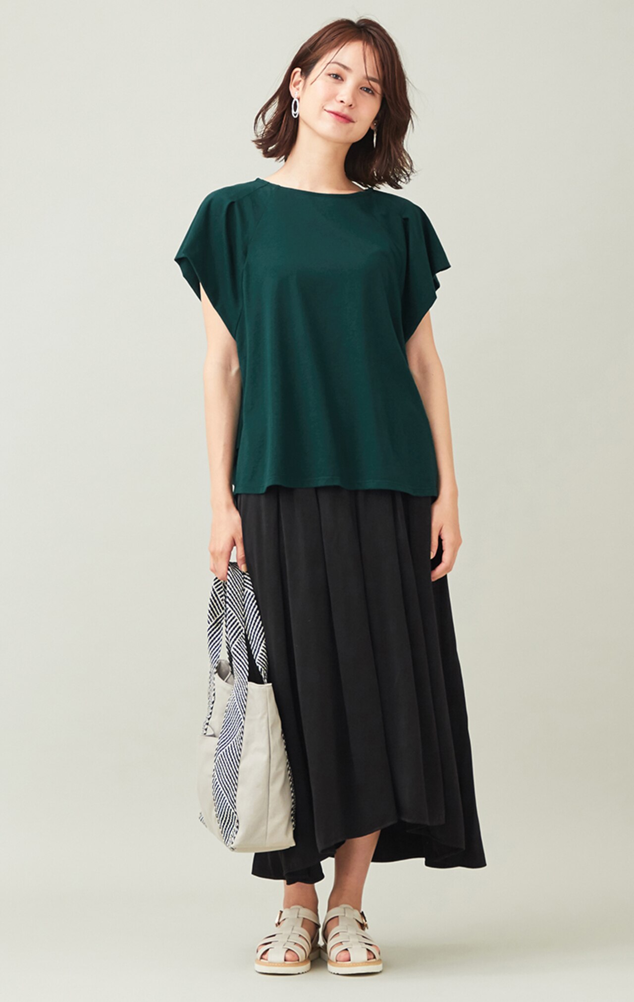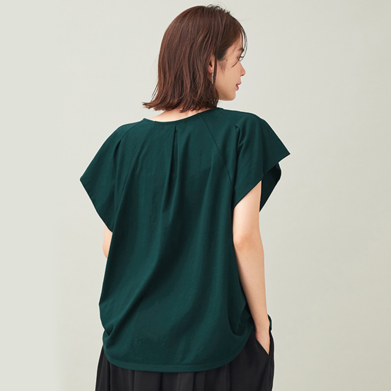 夏に嬉しい接触冷感とUVケア機能が魅力のTブラウス。二重になった袖と、肩からきれいに流れるドレープが表情のあるデザインです。深みのあるグリーンが落ち着いた印象で、秋を感じる1枚。