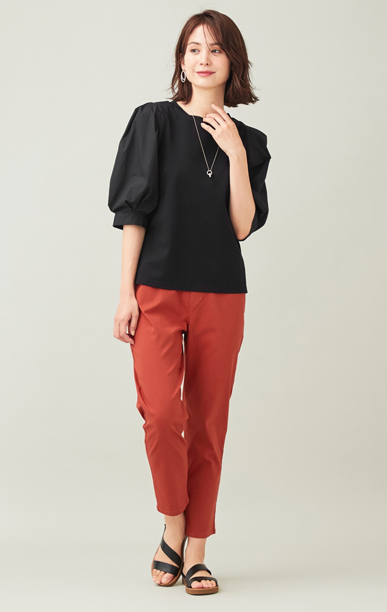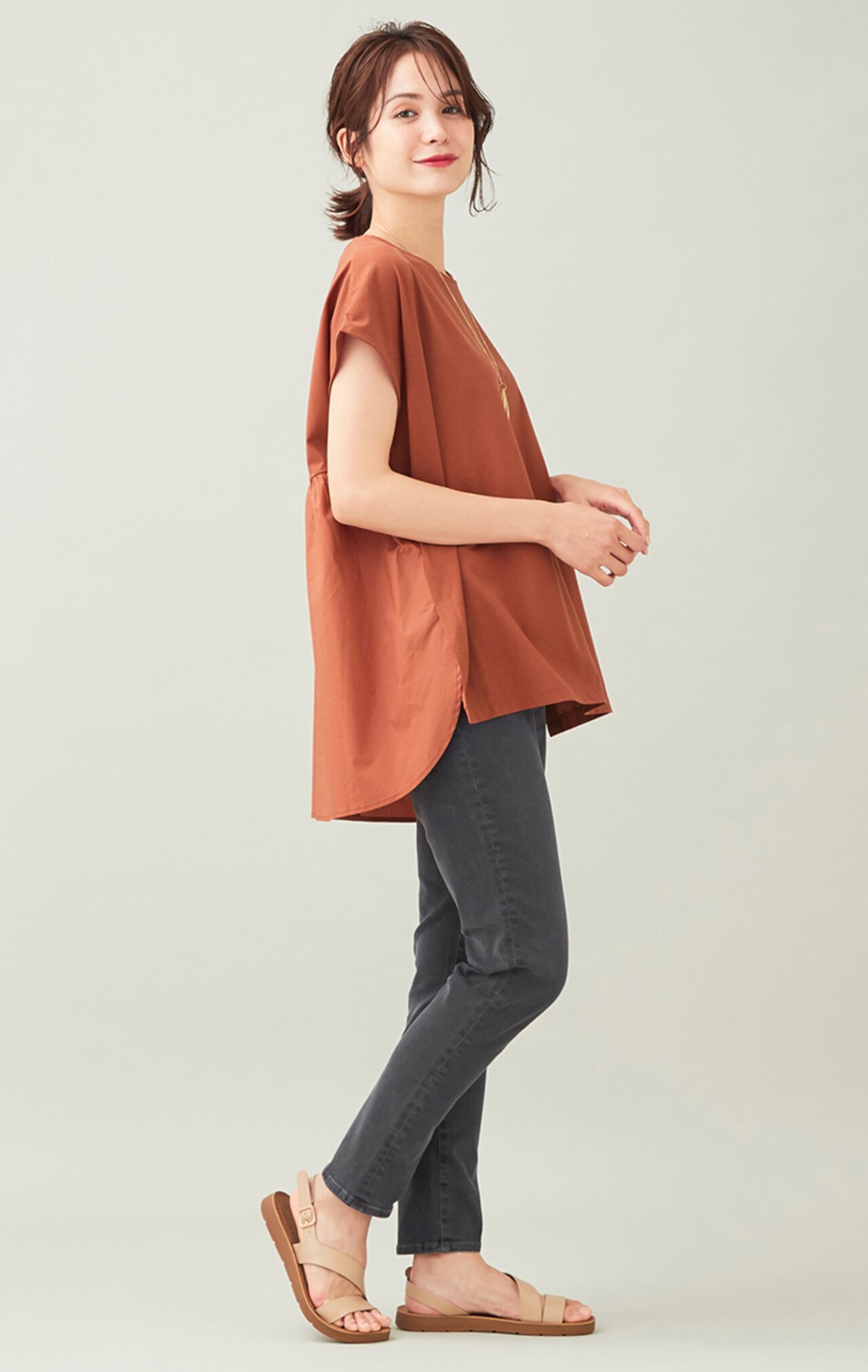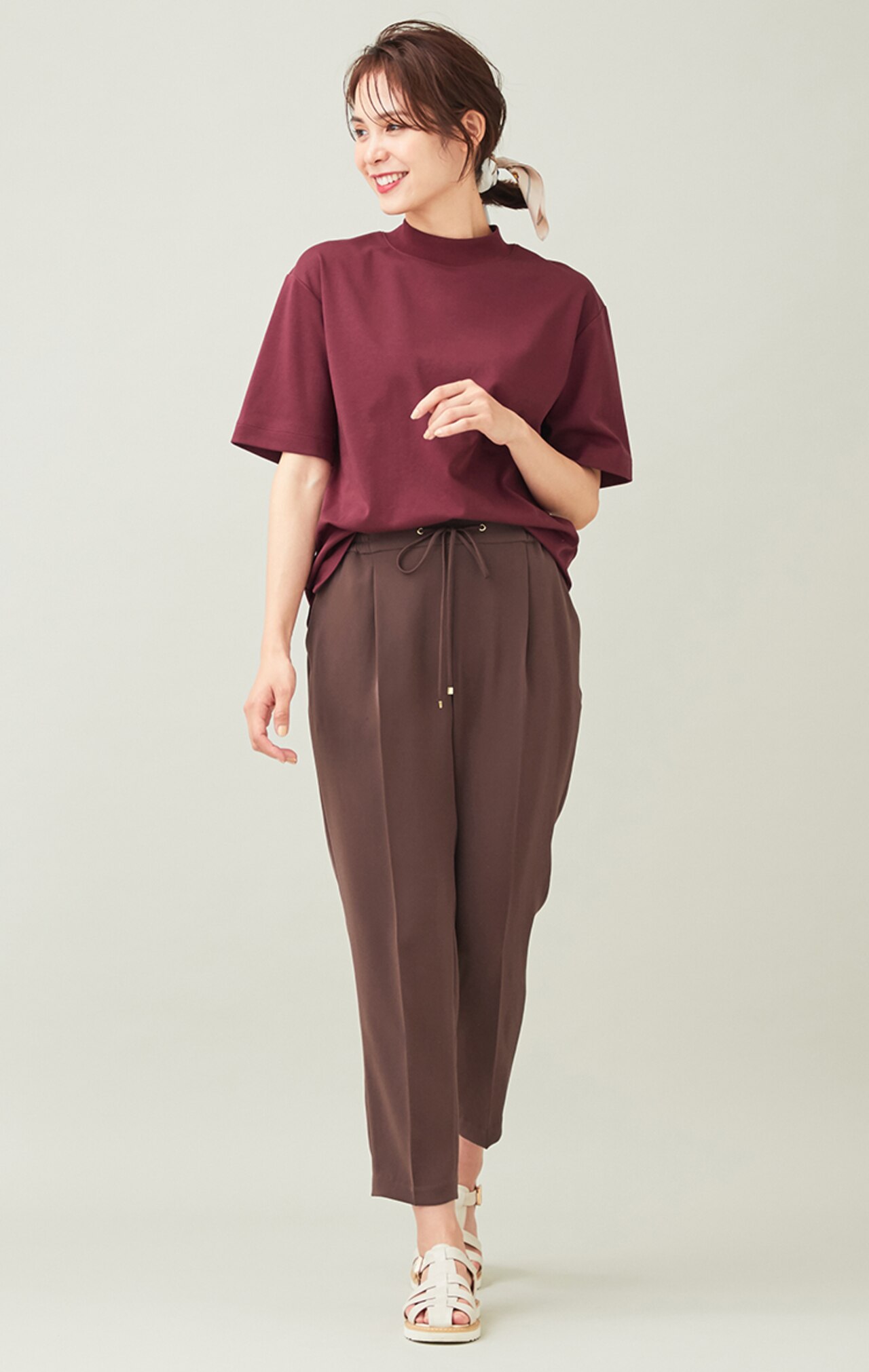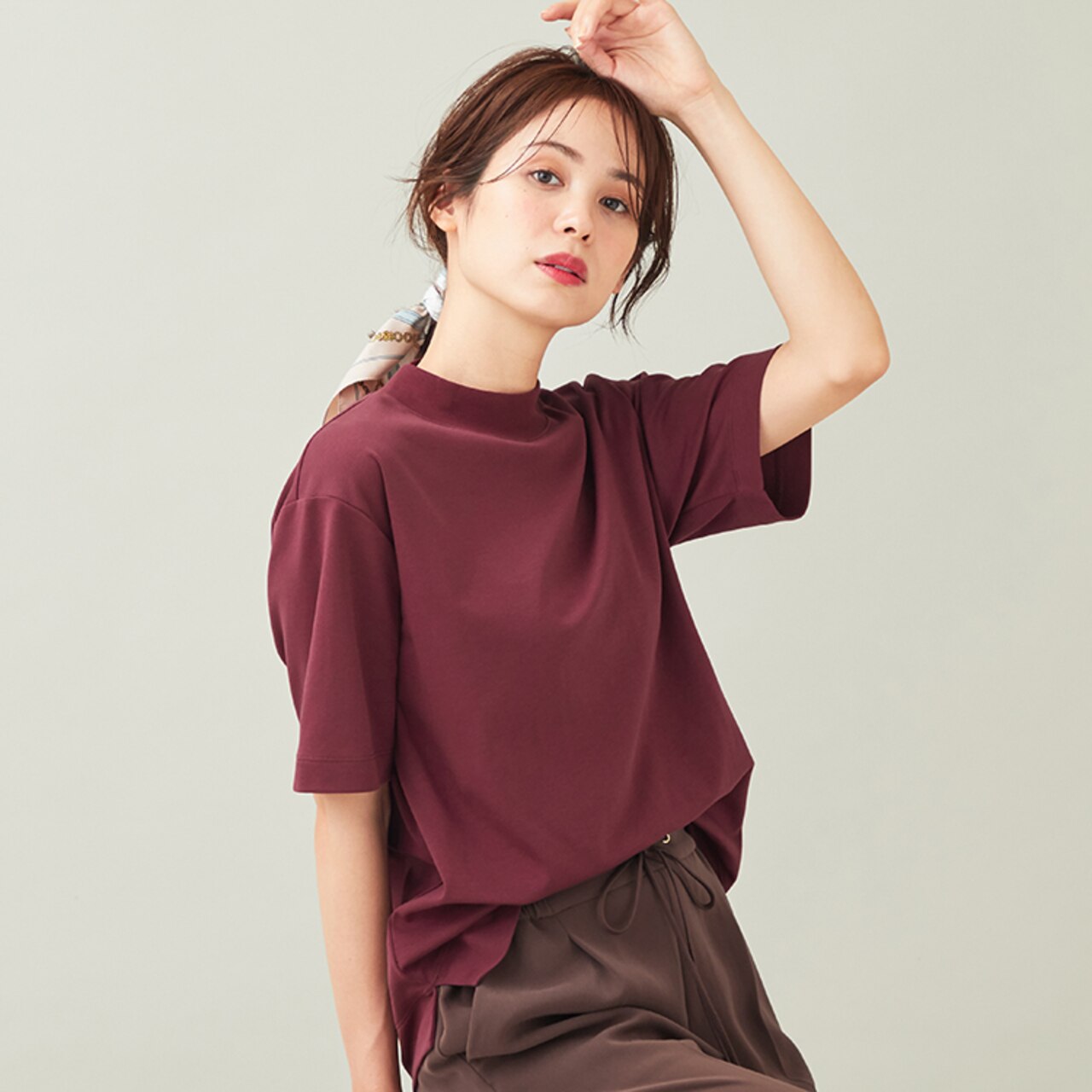 肌見せを抑え、カジュアル過ぎない印象のモックネックTシャツ。ゆったりめのシルエットと、二の腕が隠れる袖の長さが嬉しいポイント。女性らしさと品の良さを兼ね備えたボルドーカラーのトップスは、1枚は持っておきたいアイテム。