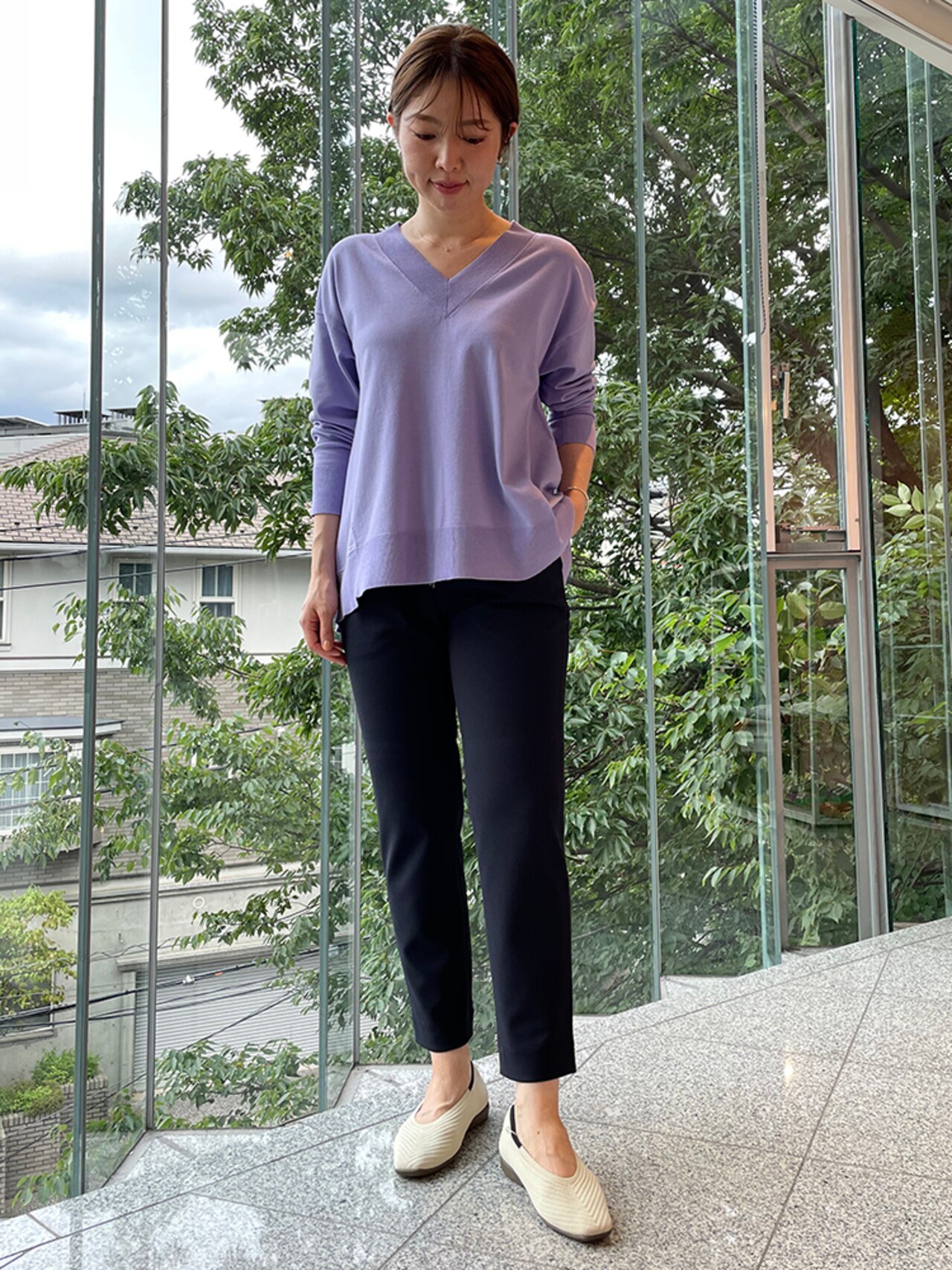 パープルがかったグレイで合わせやすく素敵なお色目です。パンツにもスカートにもOK。深すぎないVネックがすっきりしていい感じです。気になる腰回りも隠してくれて、スタイルよく見せてくれます。