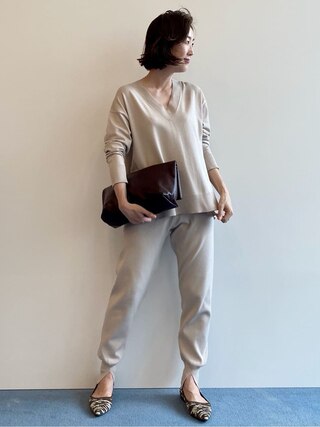 なんにでも合わせやすいニットで、Vネックも深すぎず、丈もヒップが隠れ丁度良い感じです。