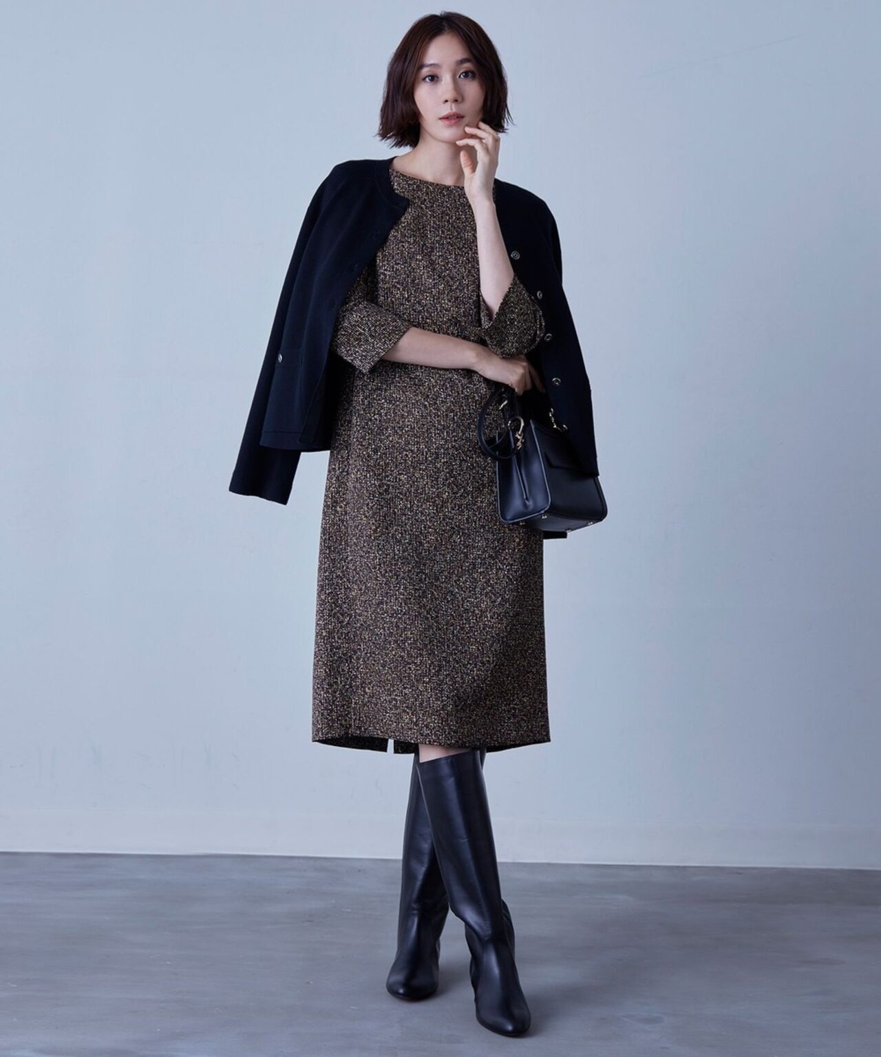 さり気ないツイード調の柄を手書きで表現。まるで本物のツイードのように見える仕上がりに。すっきりとIラインシルエットだけど、ストレッチが効いているのでストレスフリーな着心地。ワンピースワンピース自由区¥36,960(税込)ワンピースワンピース自由区 L¥39,160(税込) -