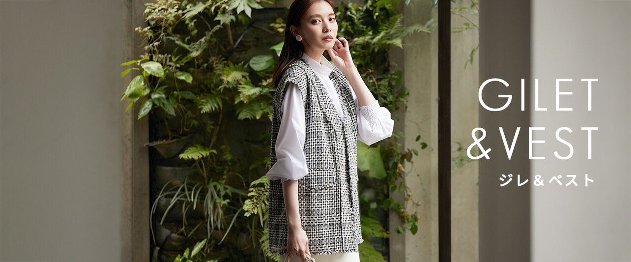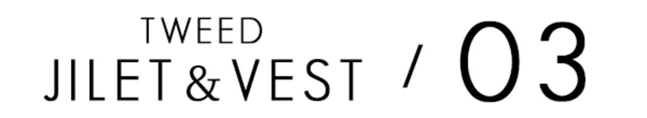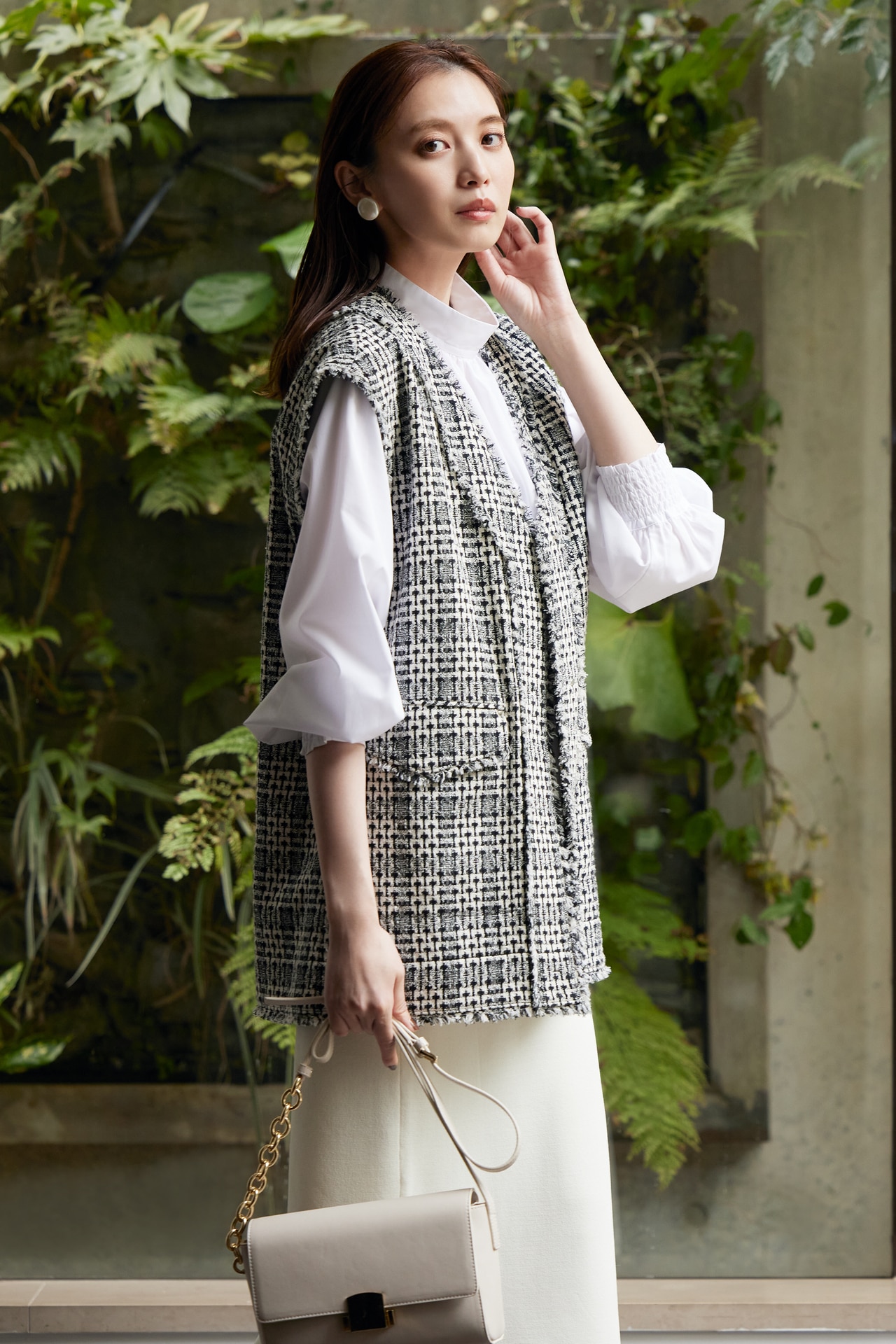 着映え力重視で選びたい、上に重ねるツイードジレ。オーバーサイズのジレは、あえてゆったりブラウスに、Iラインスカートで楽してスタイルアップ。