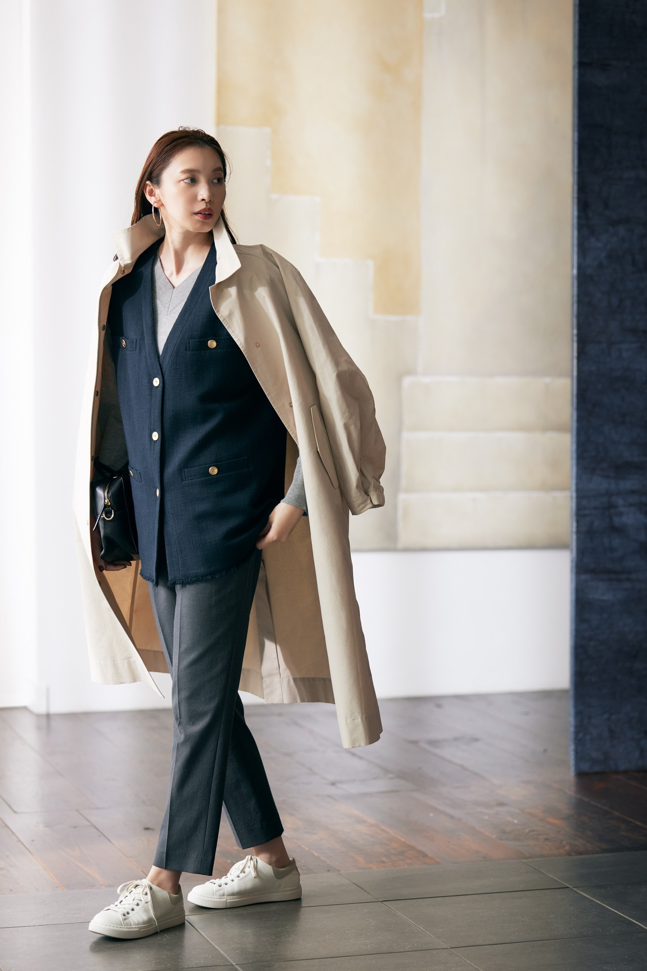 知的なネイビーで飽きないツイードジレは、夏まで使える優れもの!鮮度が上がるので、他のアイテムは全て定番なものでも。少し長めの丈で体型カバーは言わずもがな。