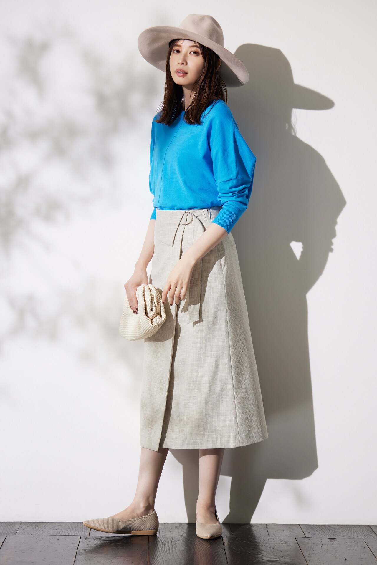 控えめなベージュのスカートは、今年注目のヴィヴィットカラーの相乗効果で、互いの良さが引き立つ。黄色、オレンジ、赤など、実はどんなカラーでも対応できるのは、さりげない凹凸感があるからこそ。
