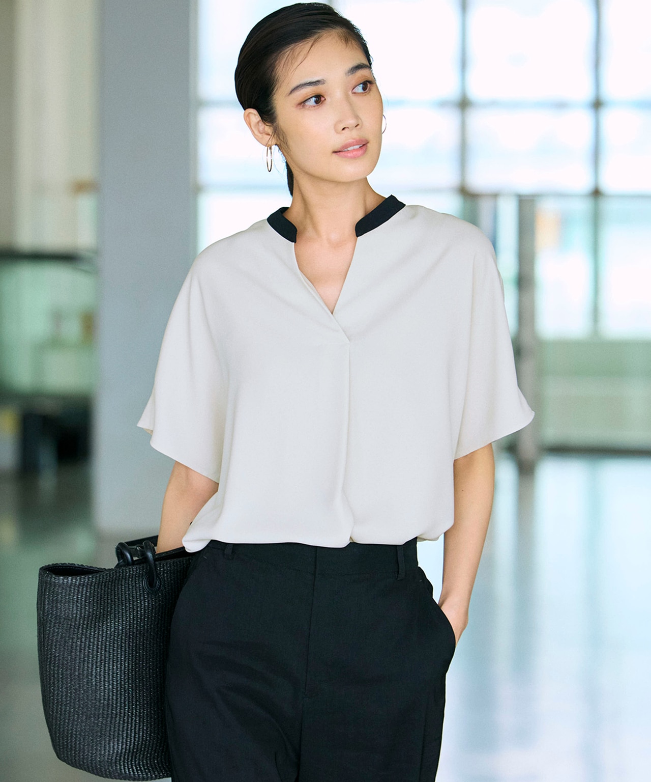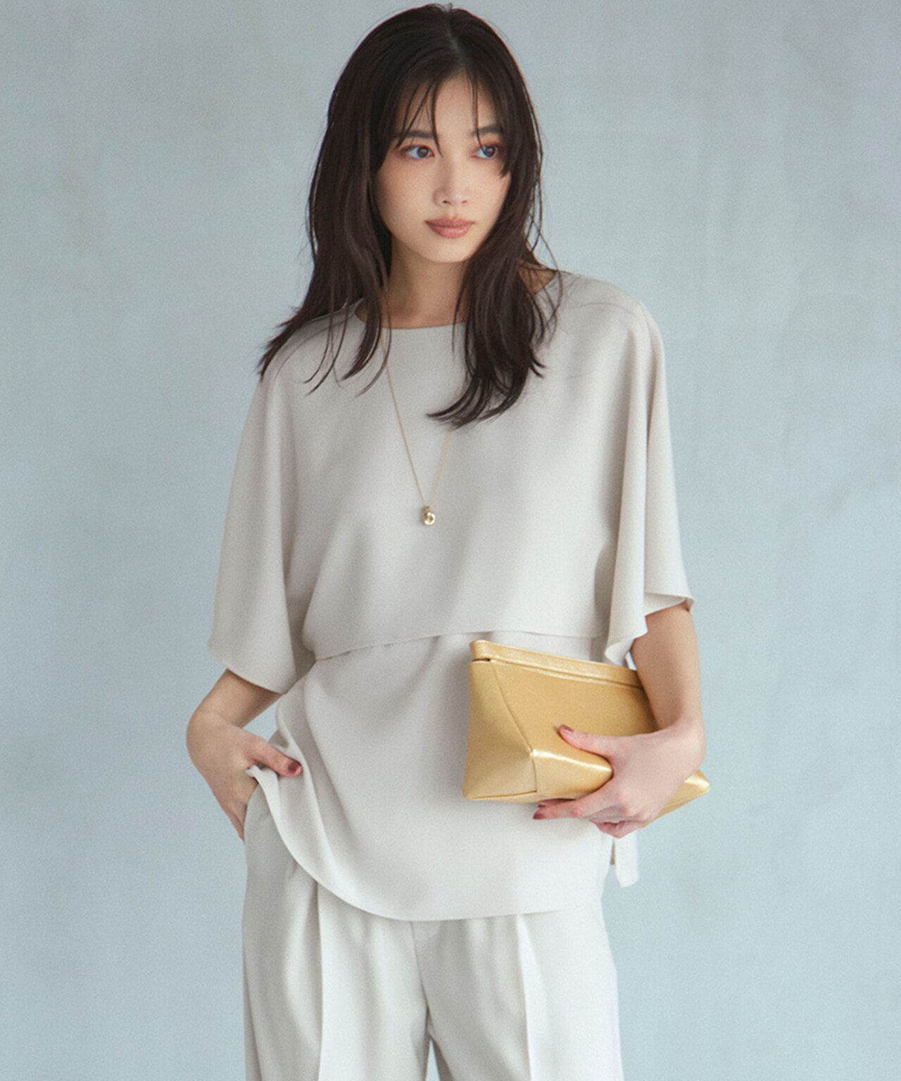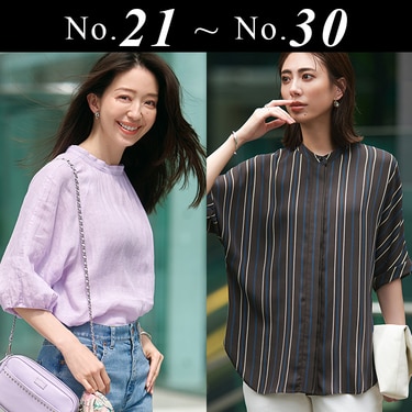 暑さを感じさせないちょうど良い袖丈&透け感。背の高くない私にはぴったりのボリューム感です。パンツに合わせて、色違いを揃えたい!