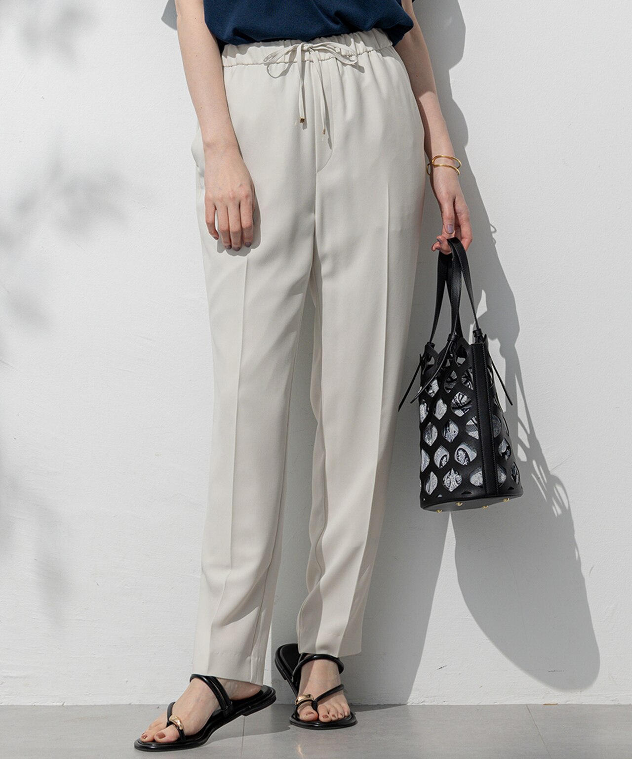 腰が張っていてセンタープレスのパンツは敬遠してましたが、生地の落ち感のお陰でスッキリ見えます。皺になりにくそうでホームケアできるなら沢山着て出かけたいです。ネイビーを購入しましたが、良い色でした。