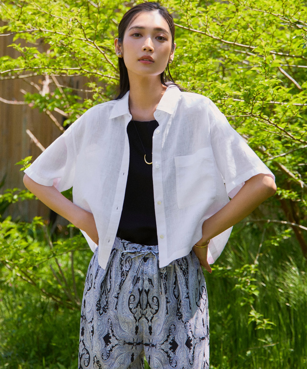夏の羽織りに最適。ほどよいシアー感、クロップド丈とおしゃれ要素も満載で素敵です。シワにもならず、ワイドパンツにもスカートにもバッチリでいろいろ着回しできそうです。買ってよかった!