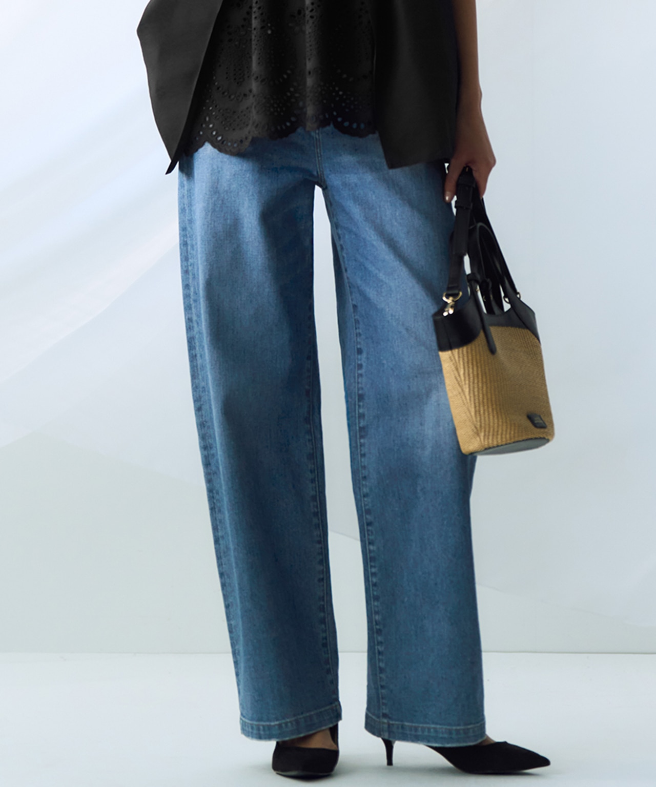 クロップド丈のブラウスに合わせて、店員さんが勧めて下さいました。適度なストレッチで履きやすくサイズもちょうど良かった。丈は長いので折り返してスニーカーに合わせようと思います。ワイド系ジーンズは、あまり履いたことがないので新鮮です。