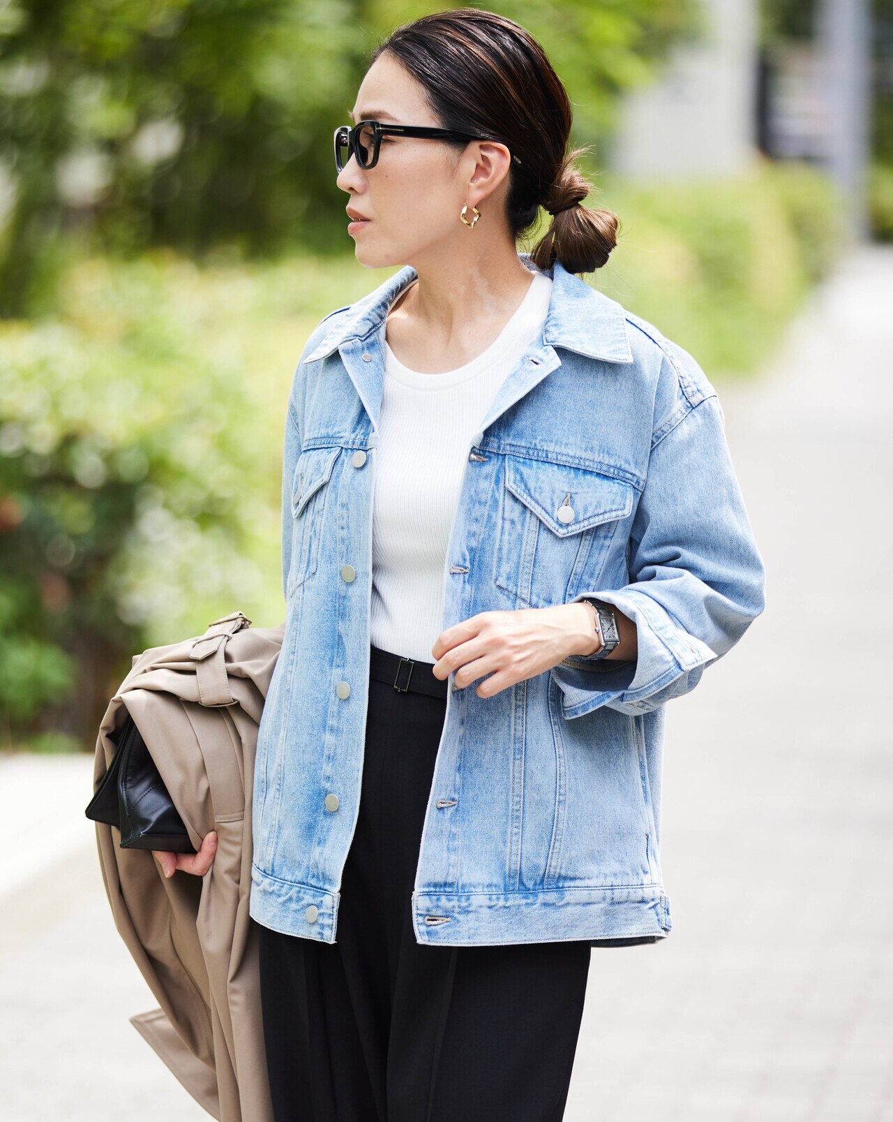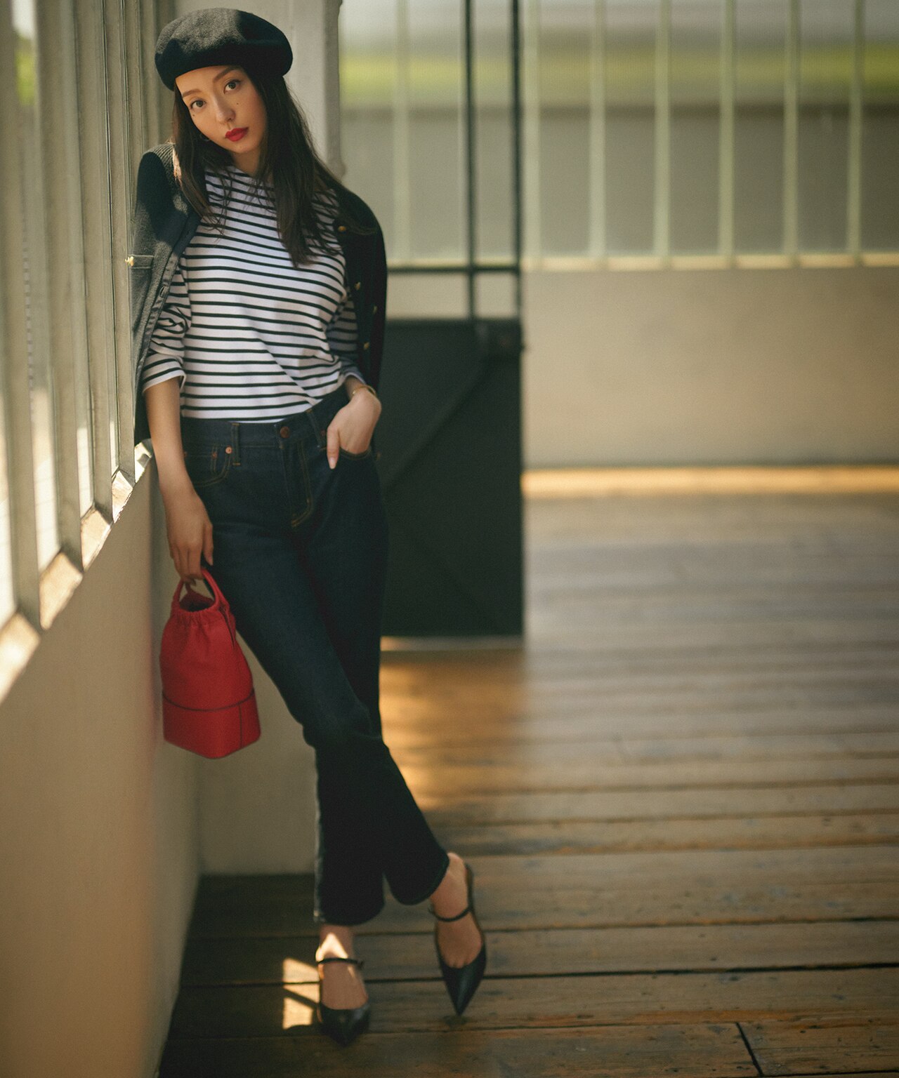 合わないトップスは無いと言っても過言ではないブルーデニム。だからこそボーダートップスや白シャツとのコーディネートをオシャレに見せるのが意外と難しい。旬なワイドシルエットを取り入れて裾をインしてスッキリ着こなせば、カジュアルご近所着からワンランクUPのスタイル完成!