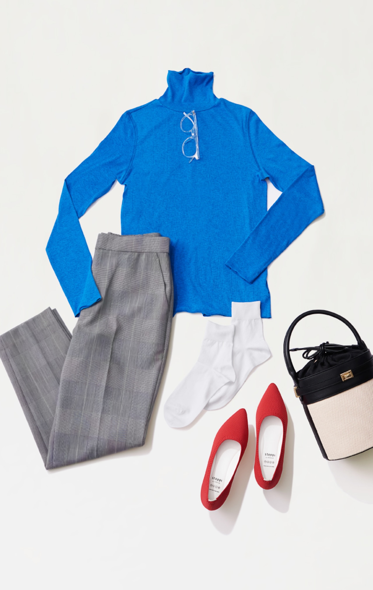 気分が上がる、明るいブルーのトップス。彩度を合わせたレッドのニットパンプスを合わせれば、洗練されたカジュアルコーデに。