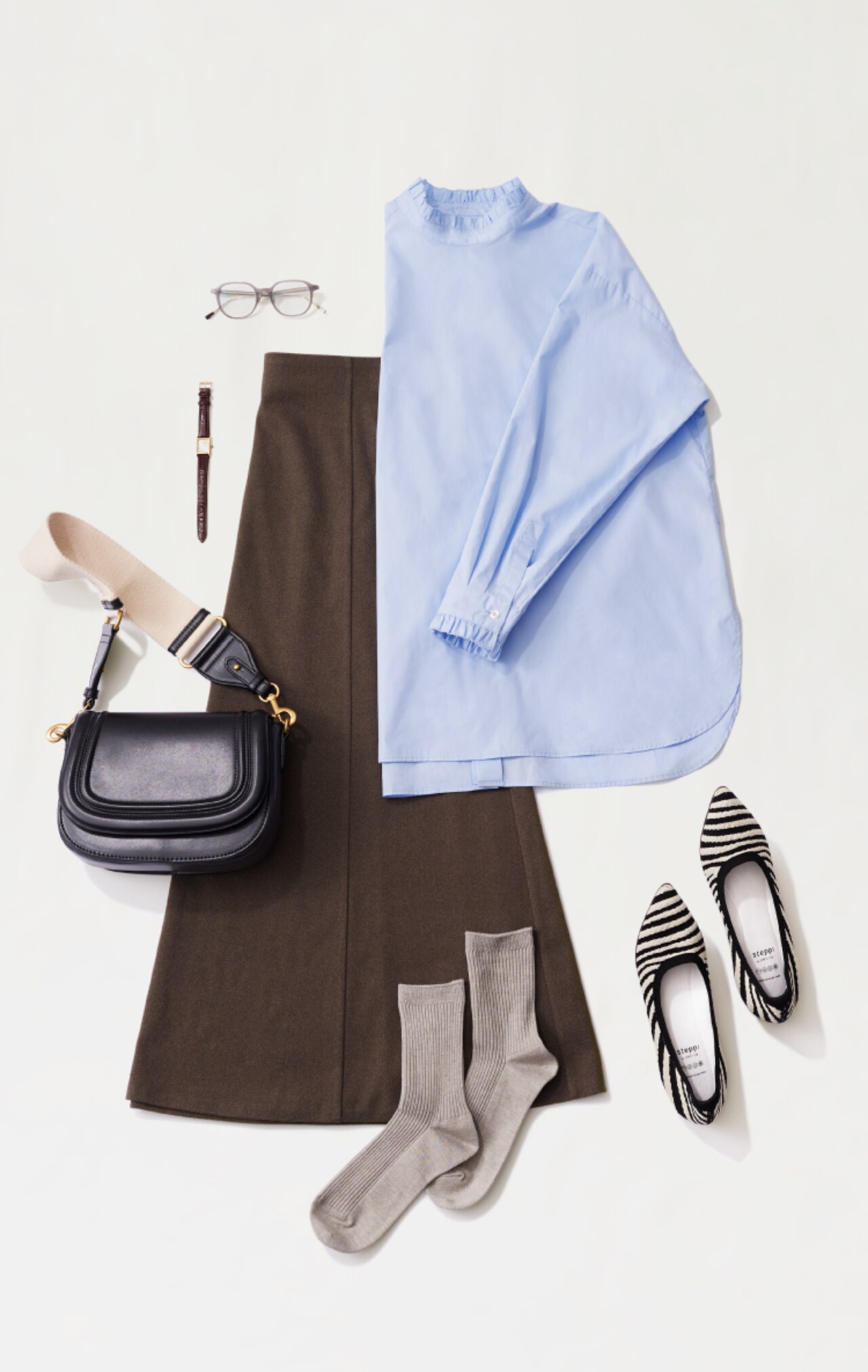 軽いから、お出かけにもはいていきたい「steppi」。襟元と袖口のフリルが大人可愛いブラウスとスカートコーデ。足もとはスカートとニットパンプスをつなぐように、薄いグレーの靴下を合わせて。