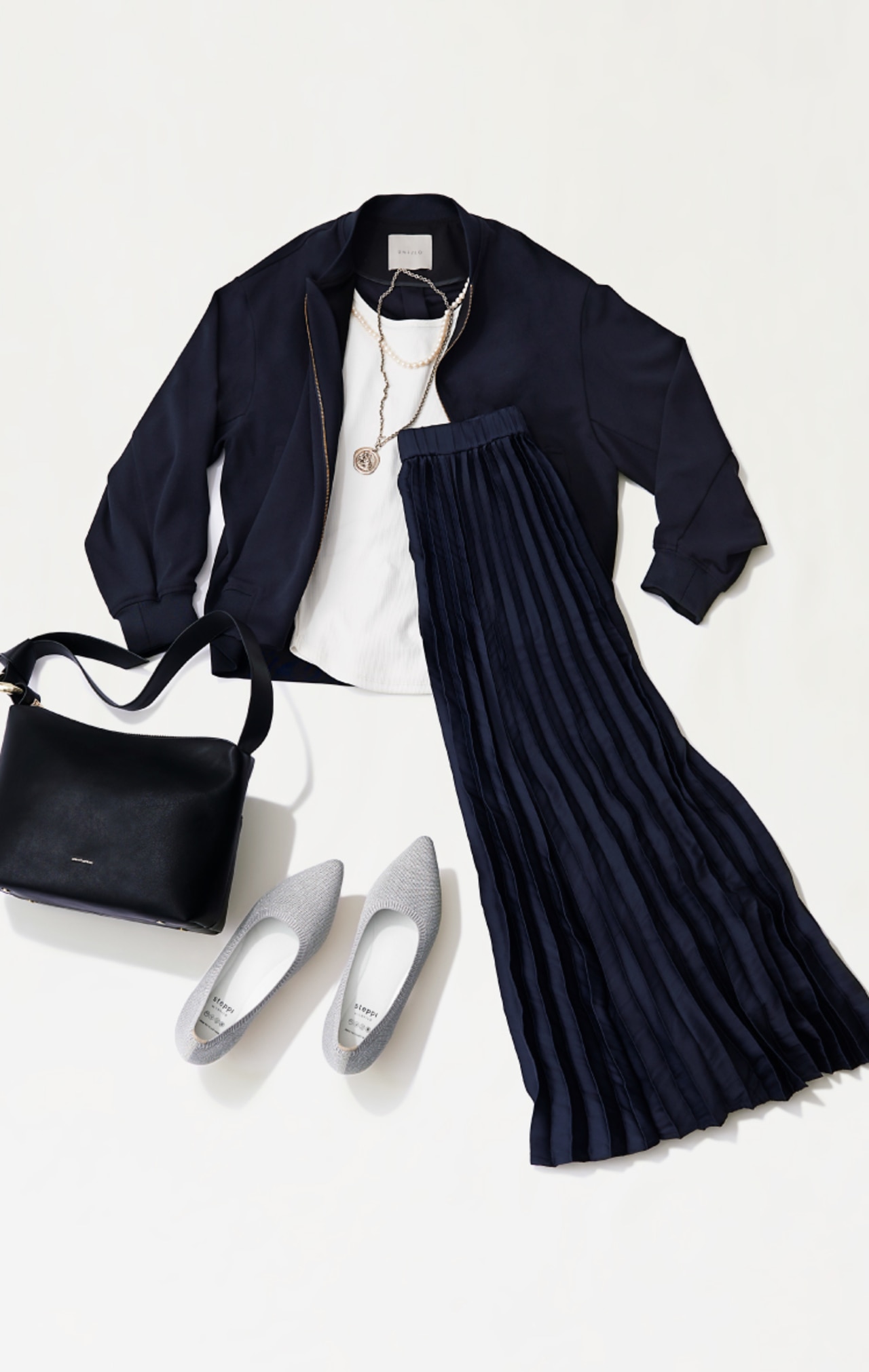 上下をネイビーで合わせた、きちんと感のあるオフィスコーデ。知的な雰囲気に華やかさを添えるシルバーラメのパンプスは、光沢感のあるスカートとも好相性!