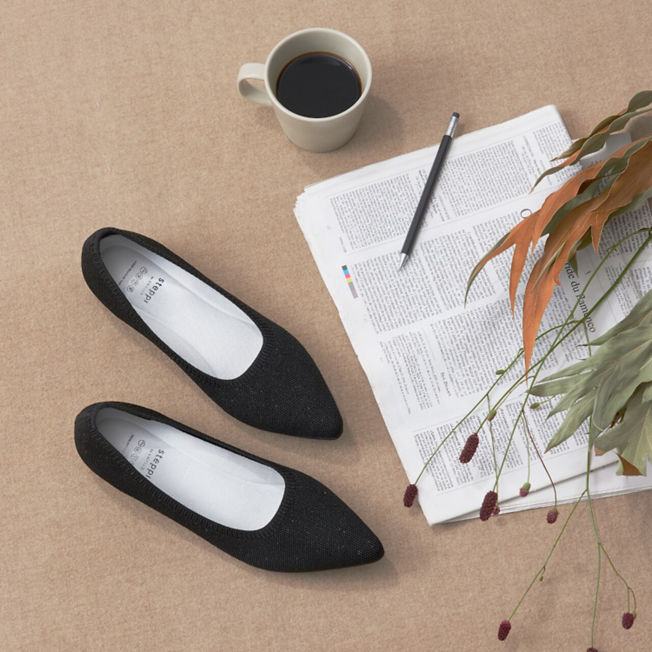 トレンドのラメは、シンプルなコーデに合わせて。雨の日も活躍する”撥水”するニットパンプスだから、合わせやすい黒のラメ入りは一つ持っておくのにオススメ。