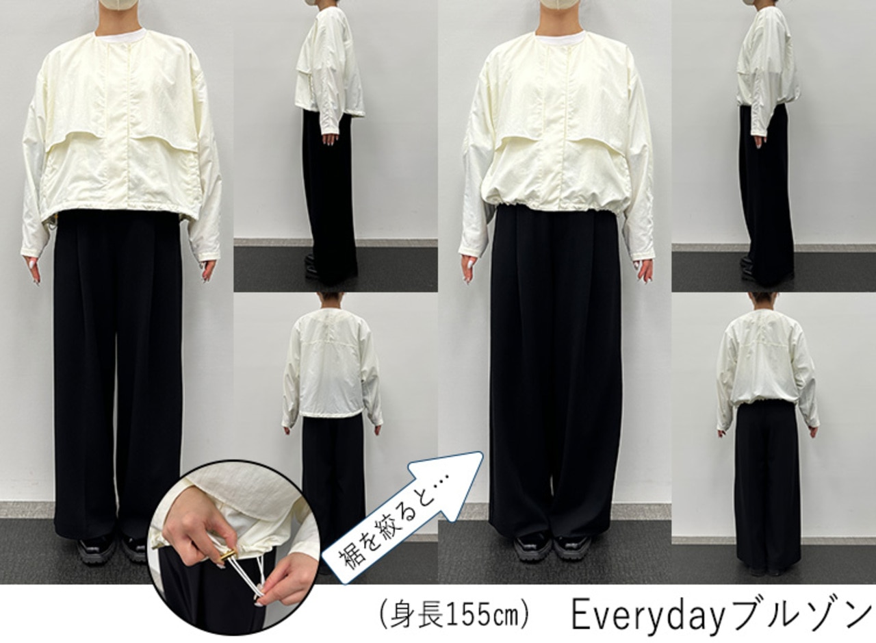 ヘビロテブルゾンはSサイズを選びますが、EverydayブルゾンはMサイズで、シャツ感覚で軽く羽織るときはそのまま、アウター感覚でしっかり着るときは裾を絞ってシルエットを変化させながら着用しています。