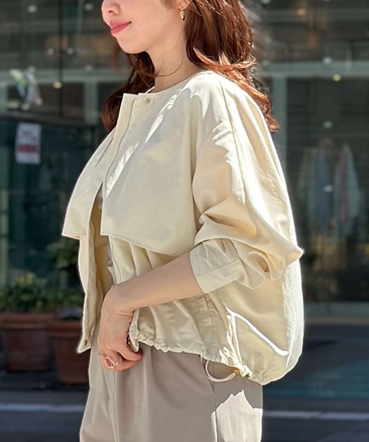 裾のドローコードを絞って裾に丸みを出すと、身長が低く、バランスが難しいワイドパンツでもメリハリのがつけられ、バランス良くスタイリングできるので好印象です!