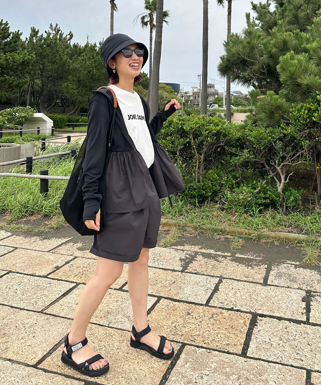 「フレア感のあるシルエットなので普段ショートパンツを履かない人でも日常に取り入れやすいデザインです!フロントのタックディティールがスポーティさを抑えてくれるので、レジャーシーン以外でも着用できます。」