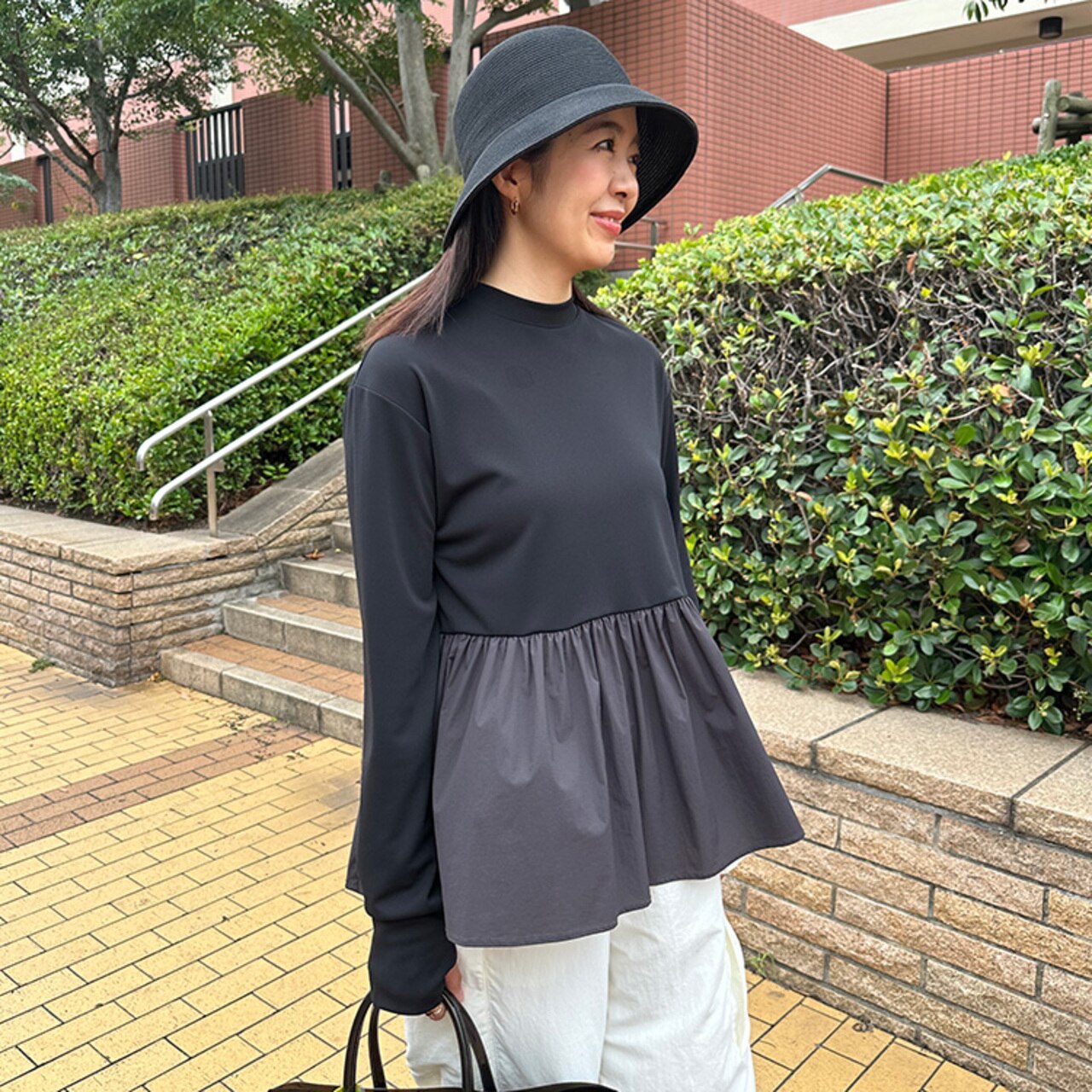 「襟元が高めなのでデコルテ周りをカバー&手の甲まで隠れる長めの袖丈で、紫外線対策にぴったりの一枚です。」