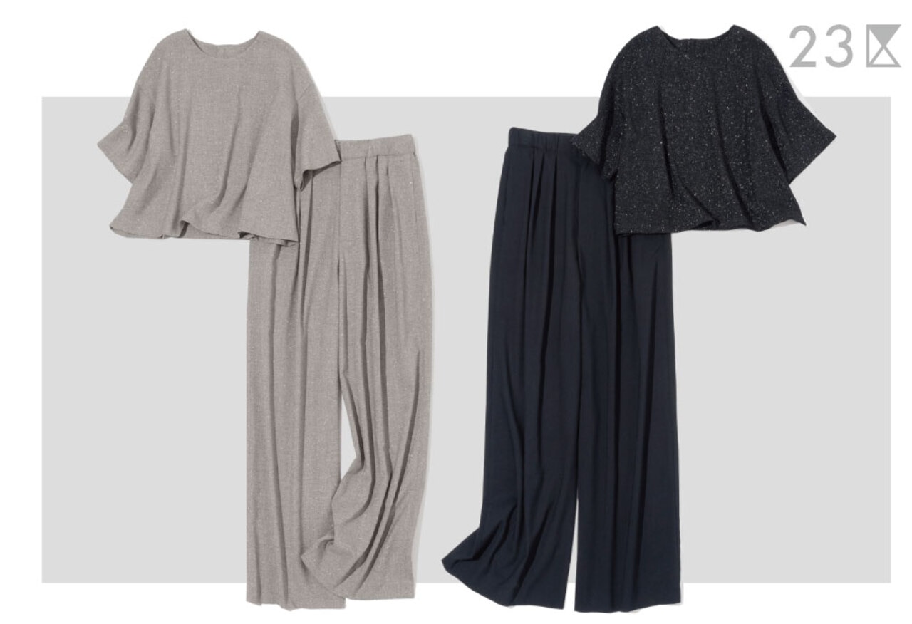 タックのボリューム感との対比で自然と生まれるコントラスト!簡単な着こなしで素敵に仕上がります。必要以上に腰回りが大きく見えないよう、タックを深めに折り畳み広がりすぎないようにしているのが23区とスタイリスト兵藤さんのこだわり。さりげにキラっと輝くラメもシンプルコーデを盛り上げてくれます。