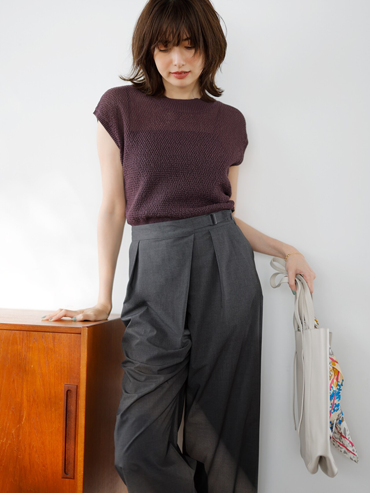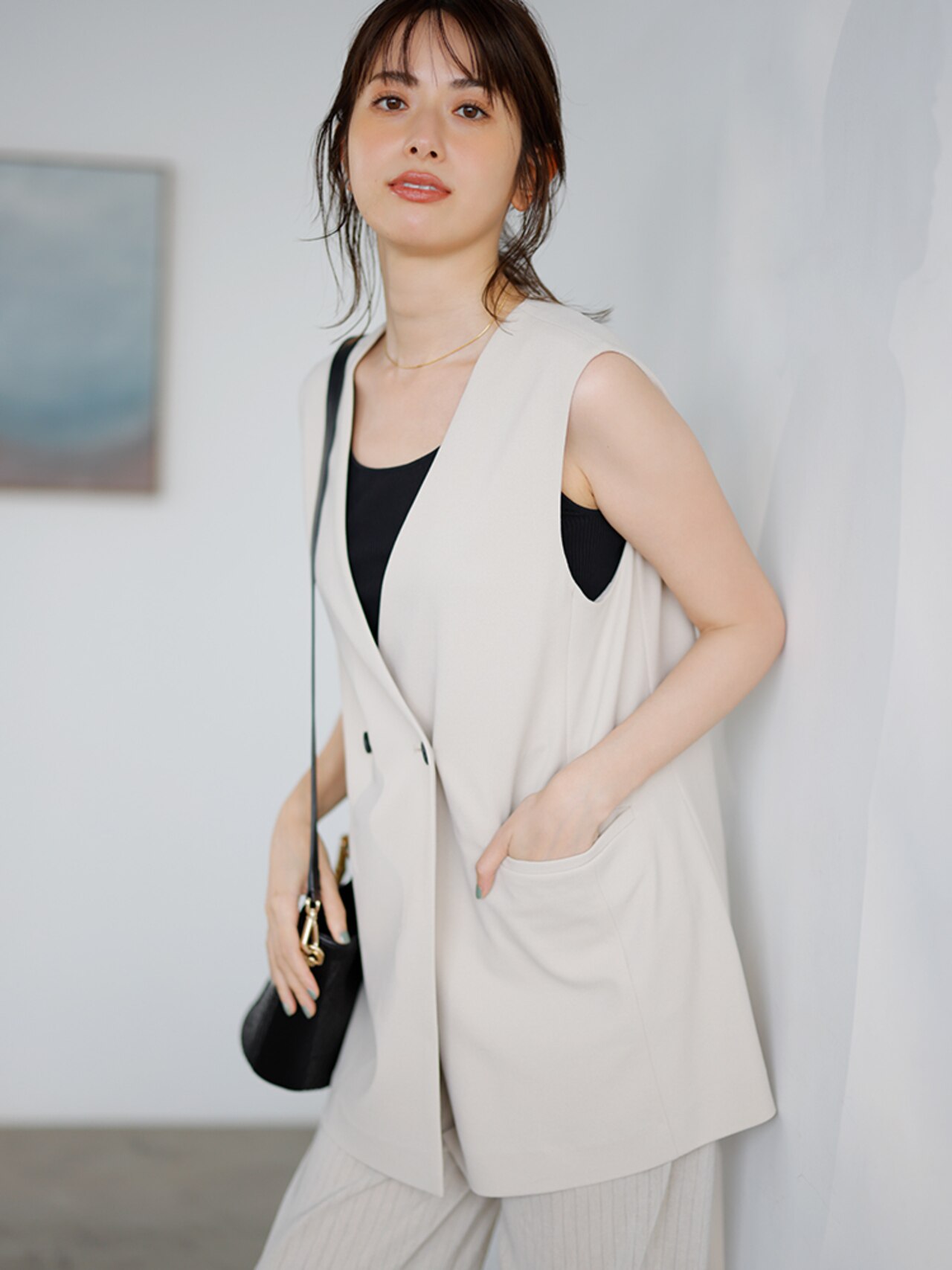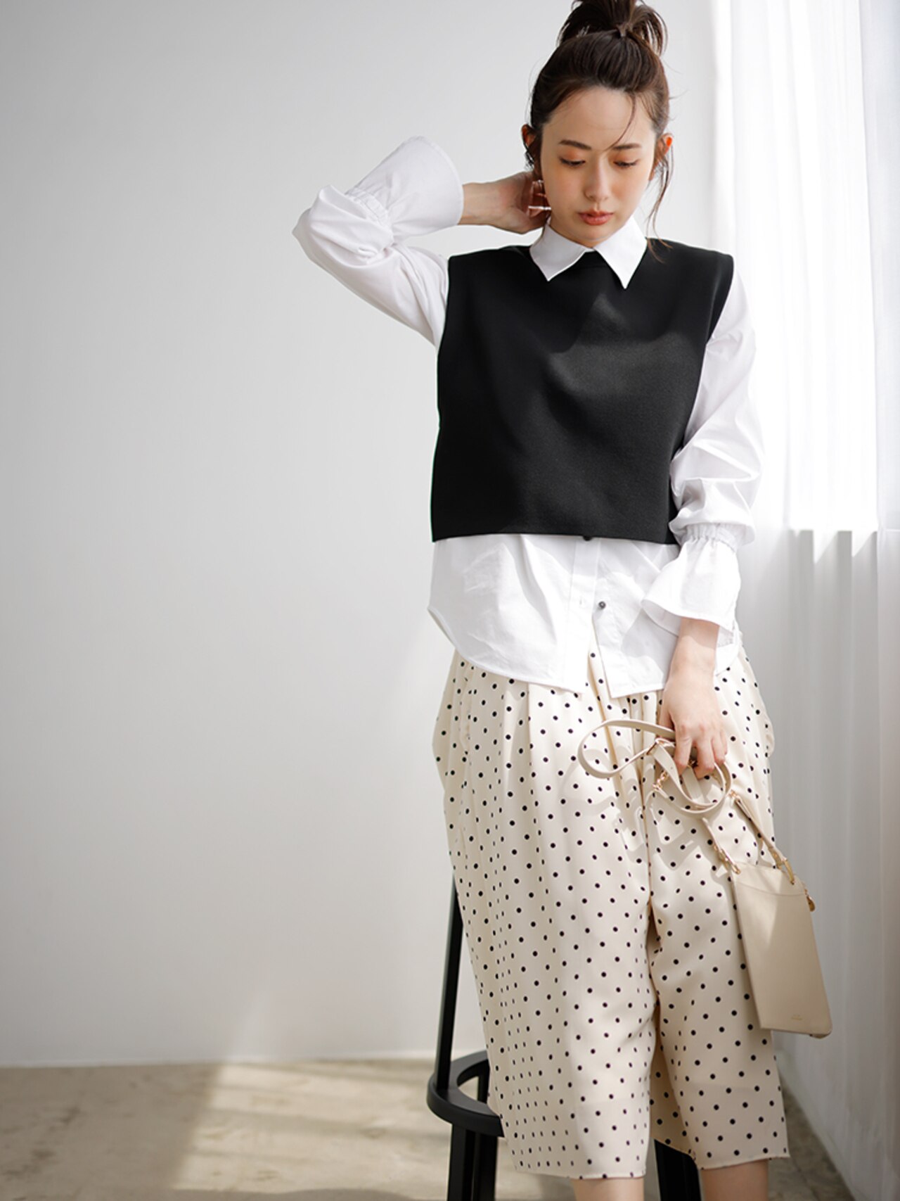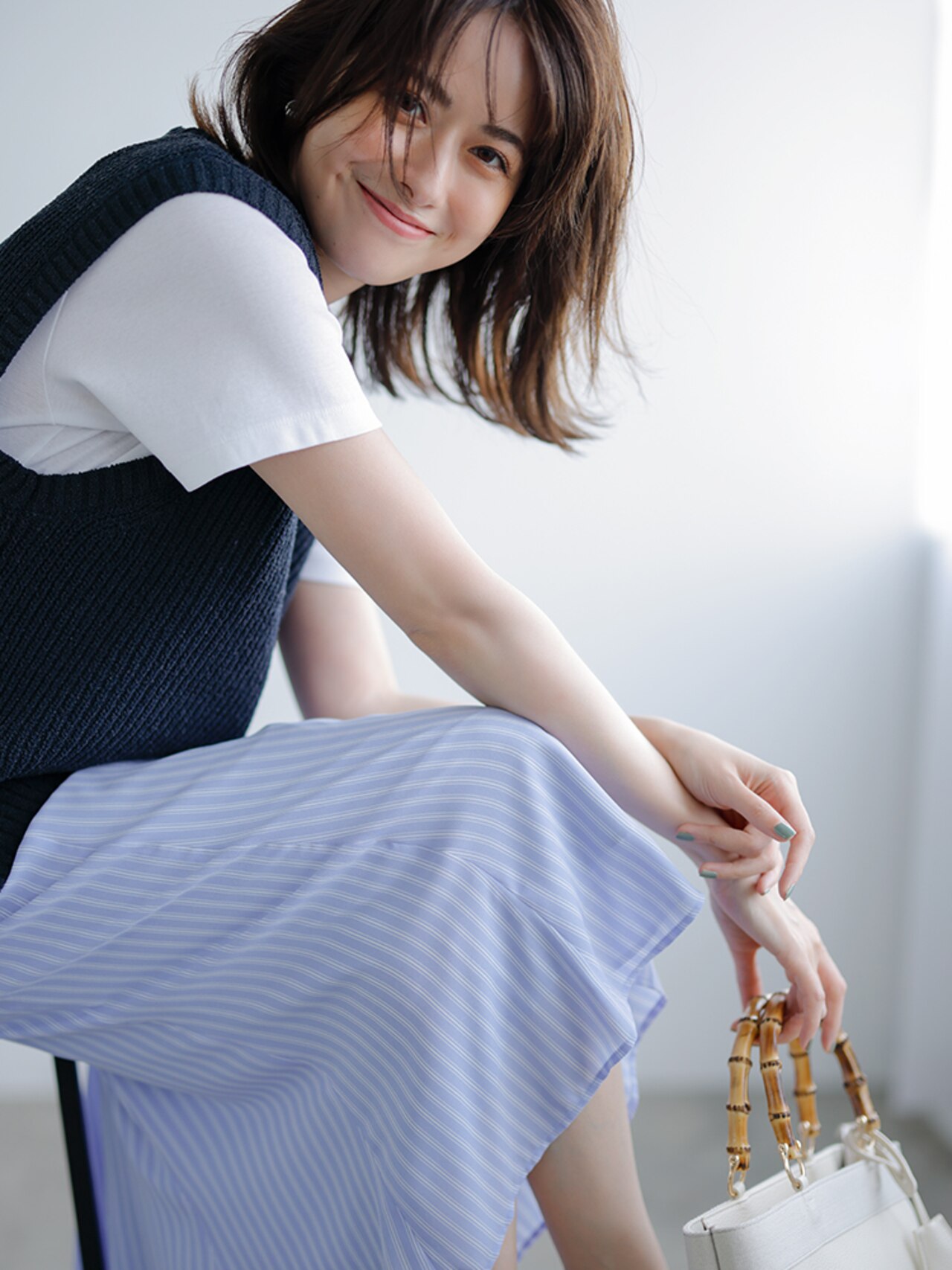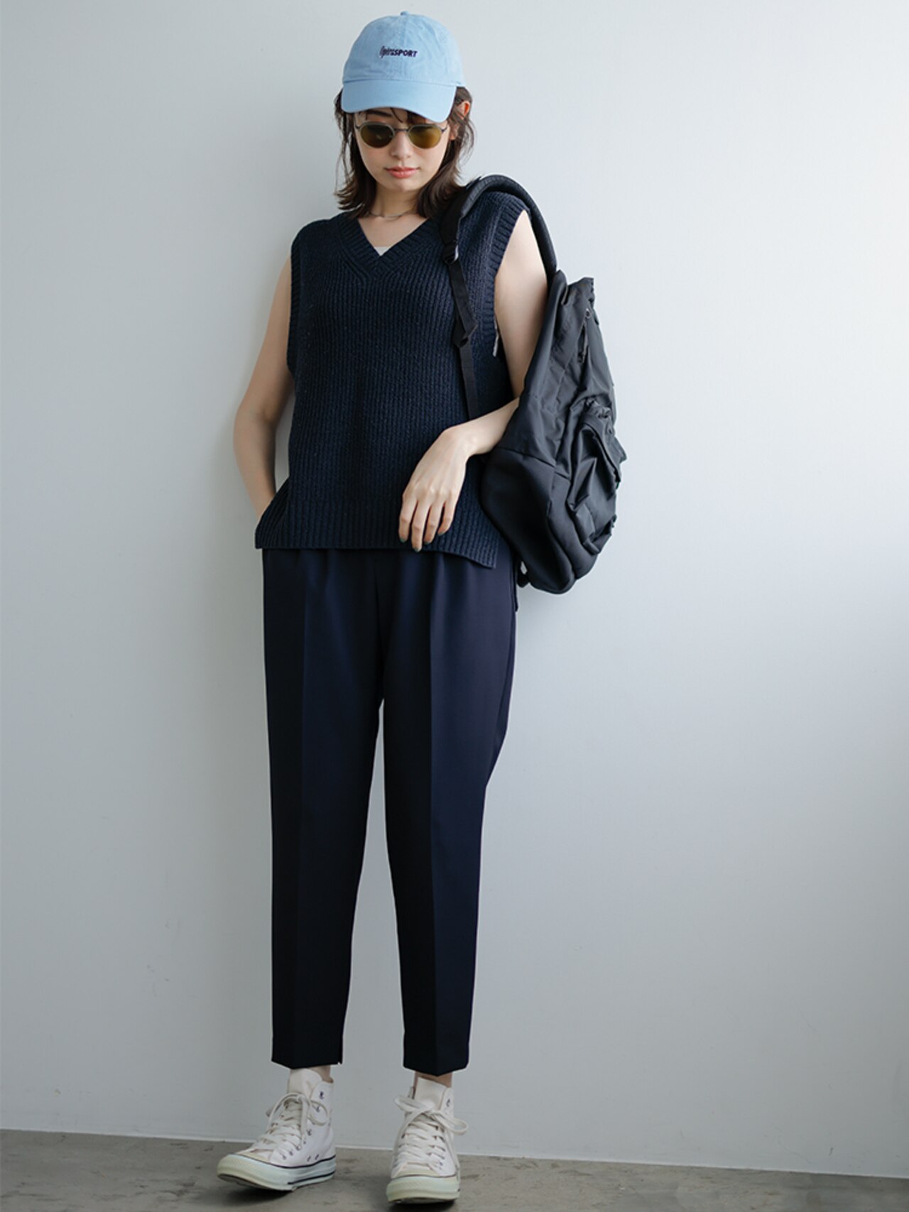 シンプル派にオススメなニットベスト。奇をてらわずに清楚に着こなすもよし。見方を少し変えるだけでざっくりとしたノースリーブニットにもなるんだから、潔く同色合わせでスポーティーに着こなすもよし。相反するけど簡単アレンジ。