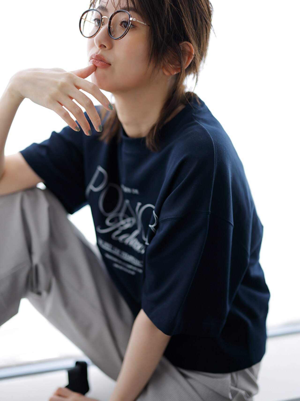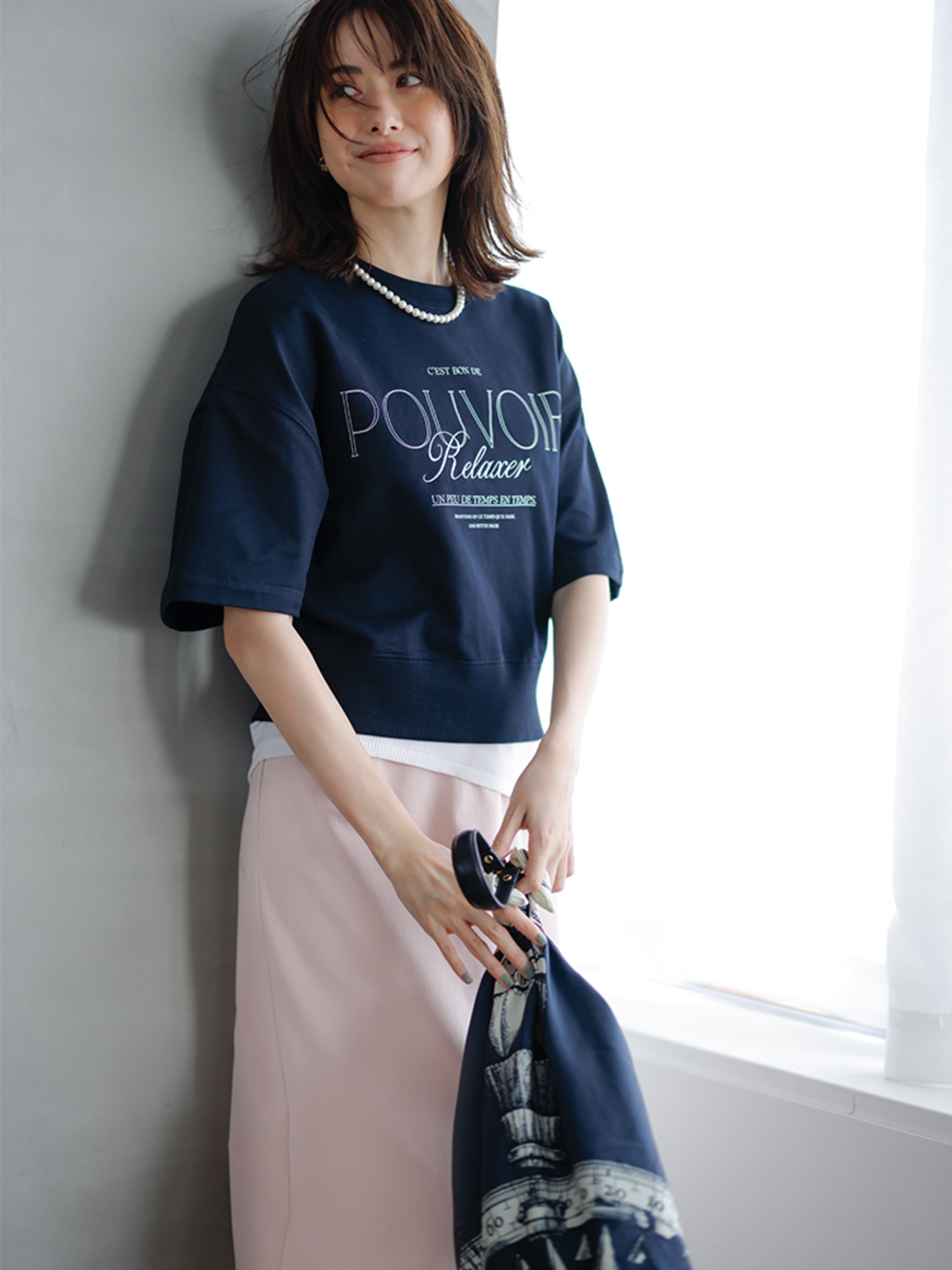 ラフ見えしやすいロゴスウェットはネイビーを選ぶのが正解。それだけで、パールをプラスすれば女っぽく仕上がり、ワイドパンツを合わせればカレッジ風なトラッドの印象に。Tシャツのように着られるけれど、Tシャツより手抜き感が無いなんて嬉しい!
