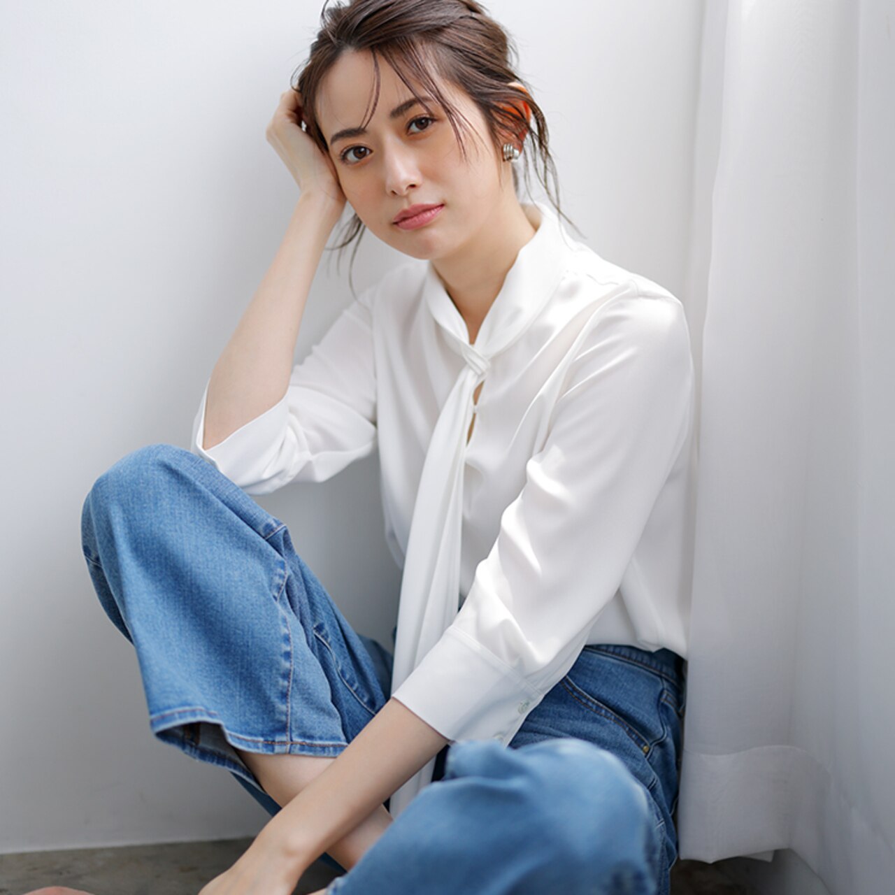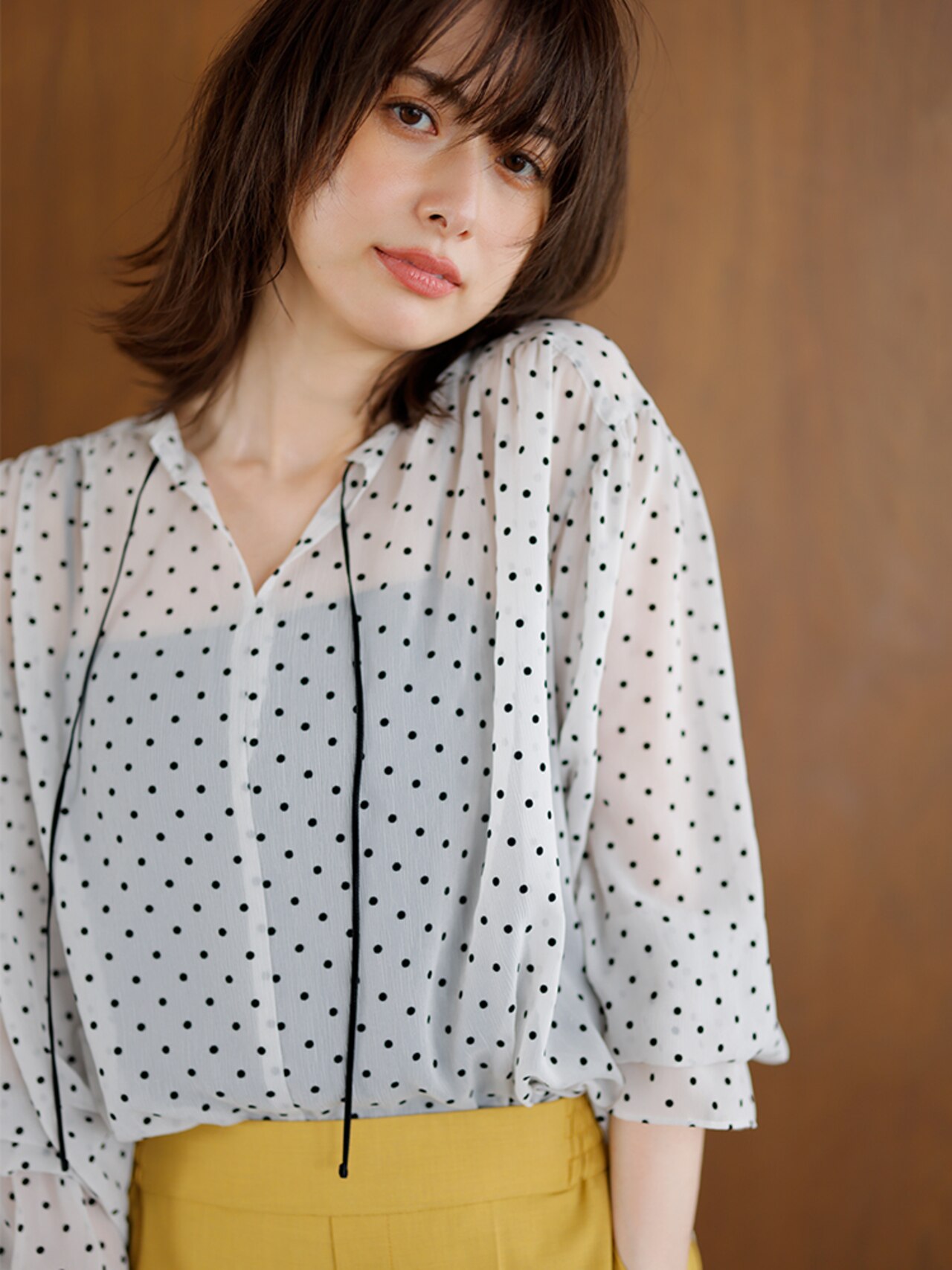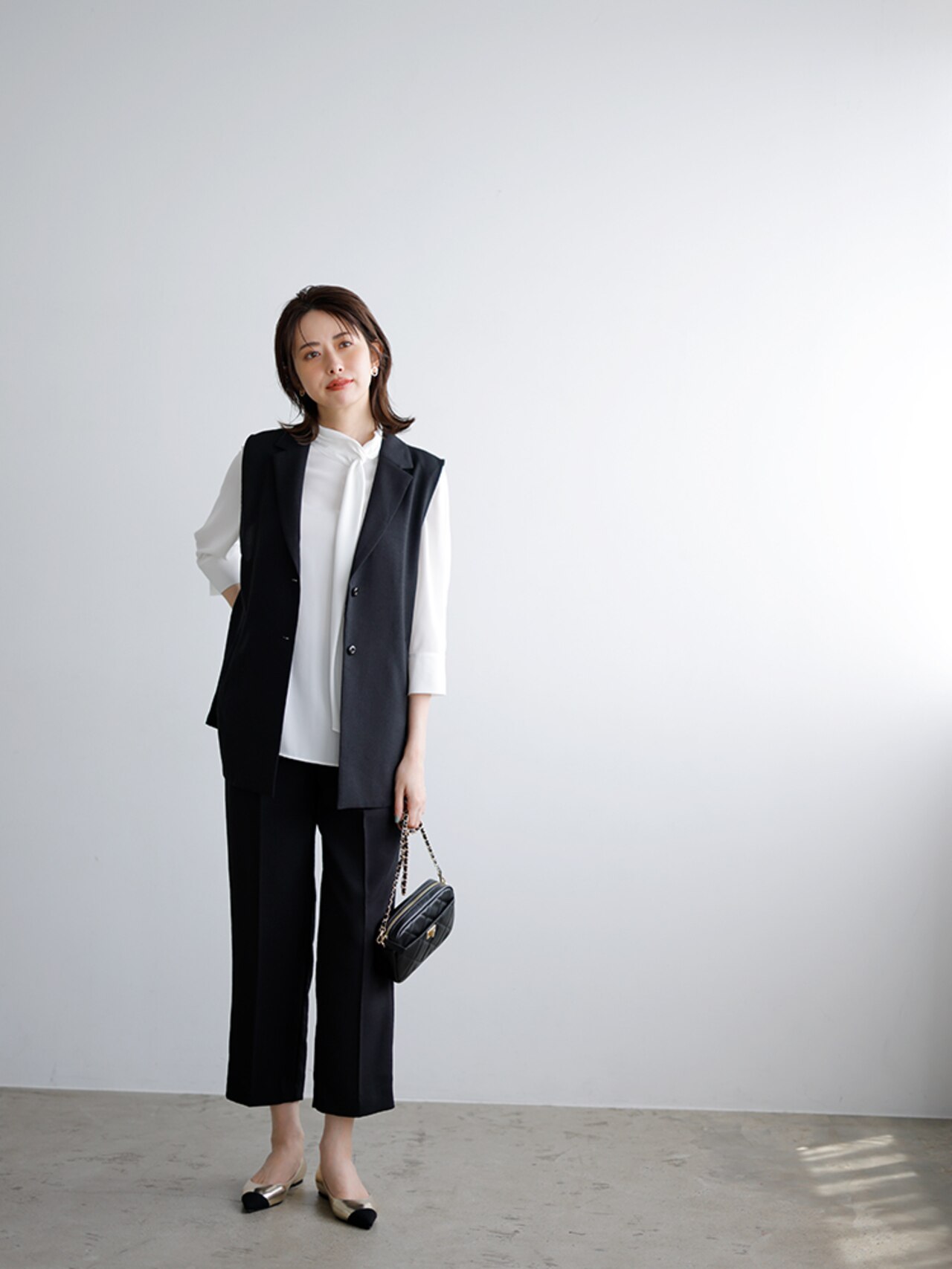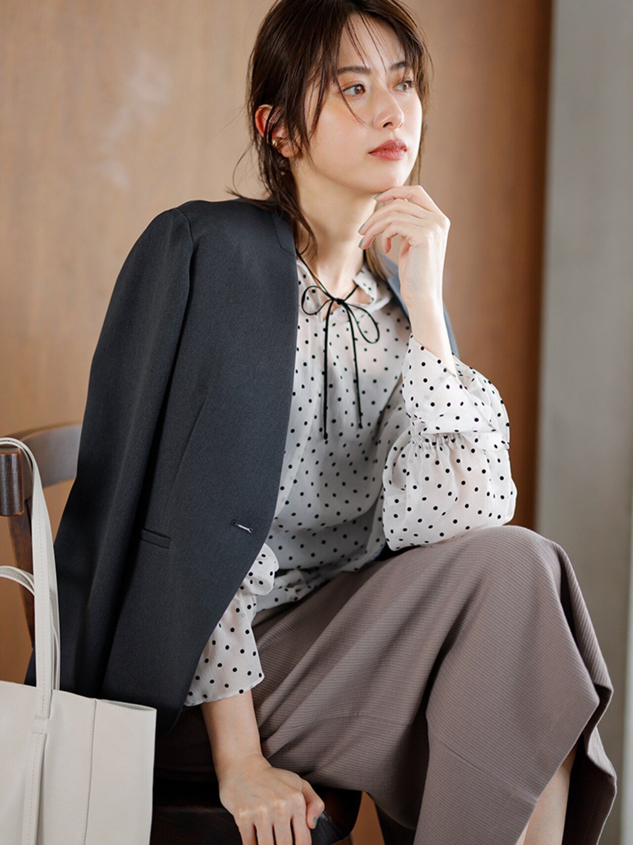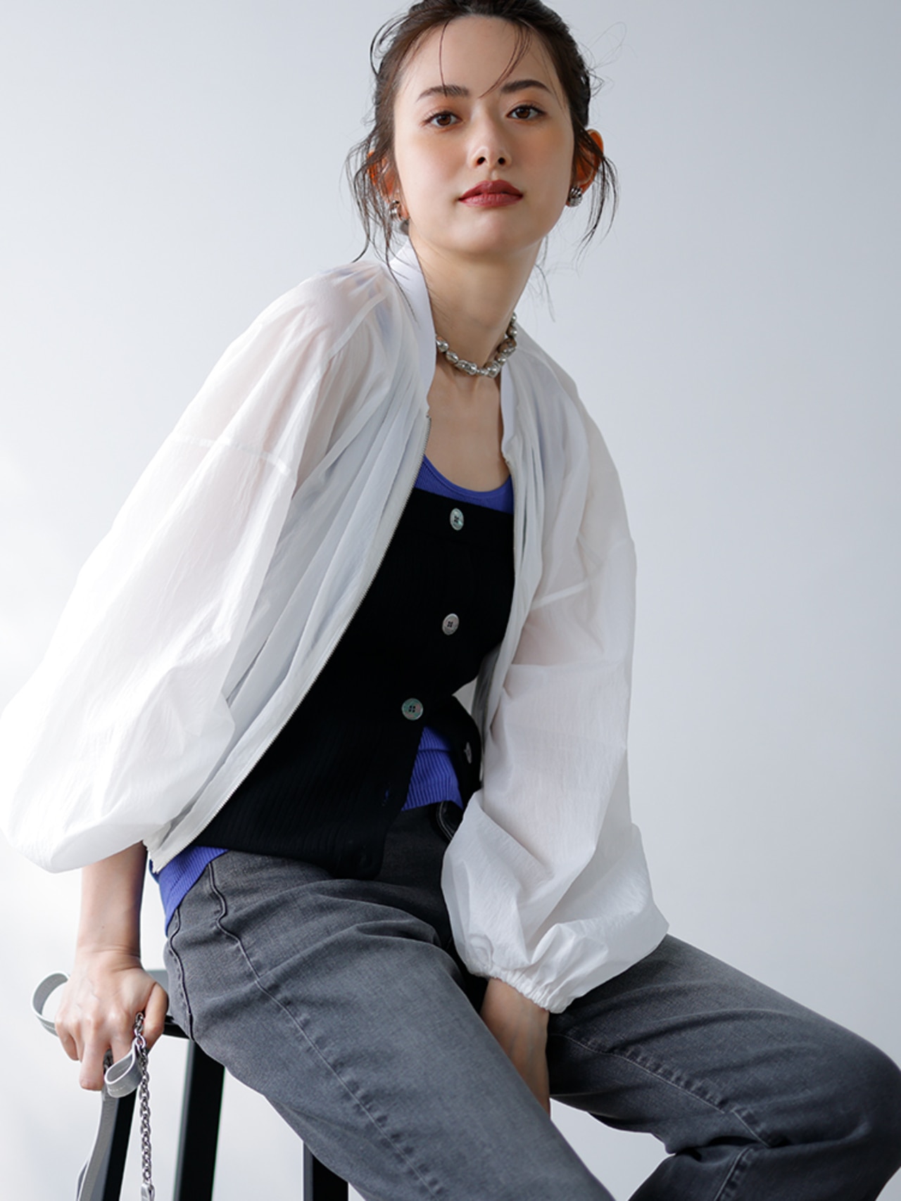 まだまだ暑いから袖をたくし上げてボリュームスリーブの映え感をプラス。カラーボトムスと相まってハッピーな印象に。ちょっとの変化が嬉しいON服。いつものジャケットとスカートも、首元で結んだリボンとシアーでさり気なくアップデート。