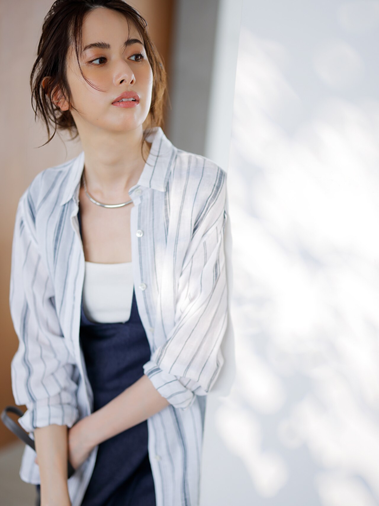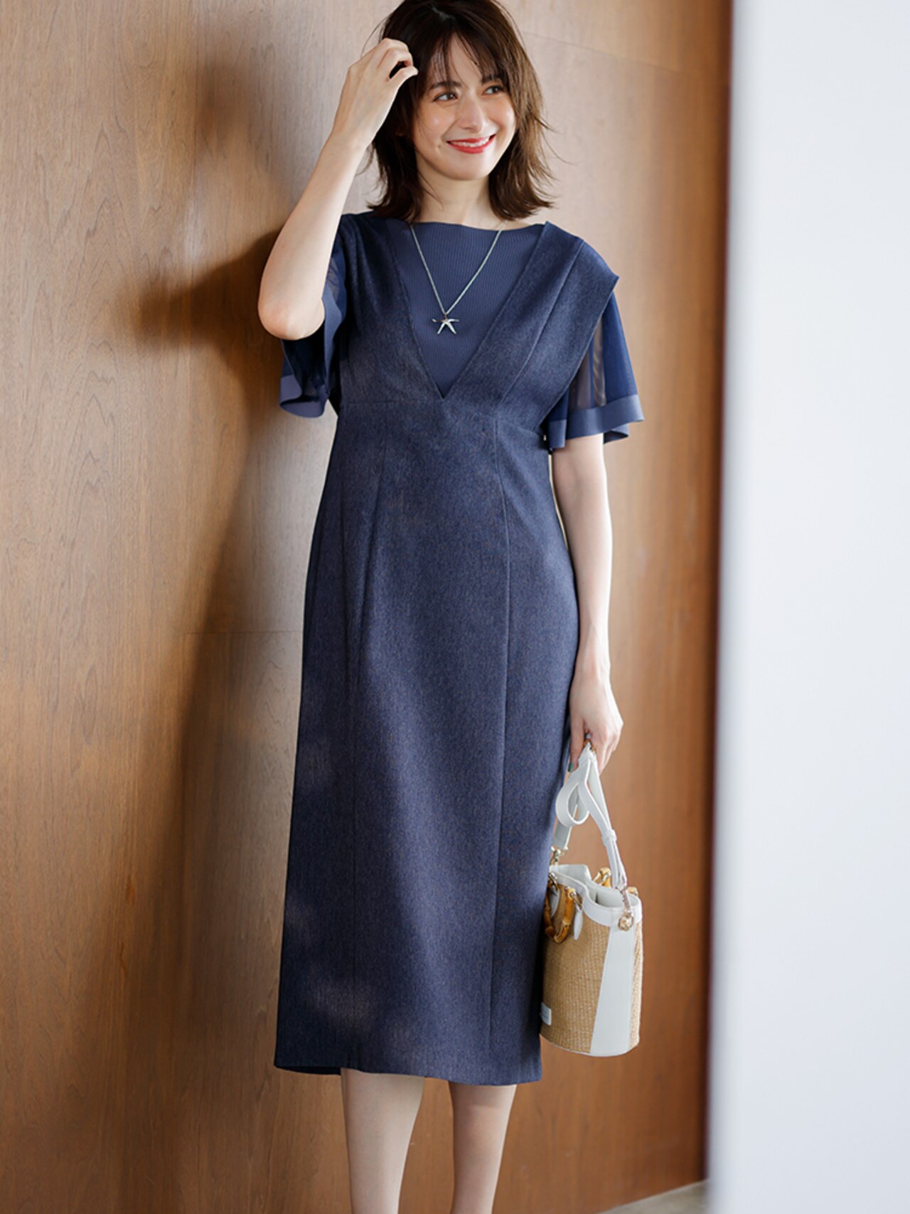 同系色のデザイントップスを合わせて、ジャンスカをワンピースのように着こなせば、袖のふんわりとスカート部分のIラインシルエットが大人の甘さを引き出す。デニムライクな素材感を活かして、タンクトップと羽織シャツを合わせれば、ハンサムスタイルにもベストマッチ。